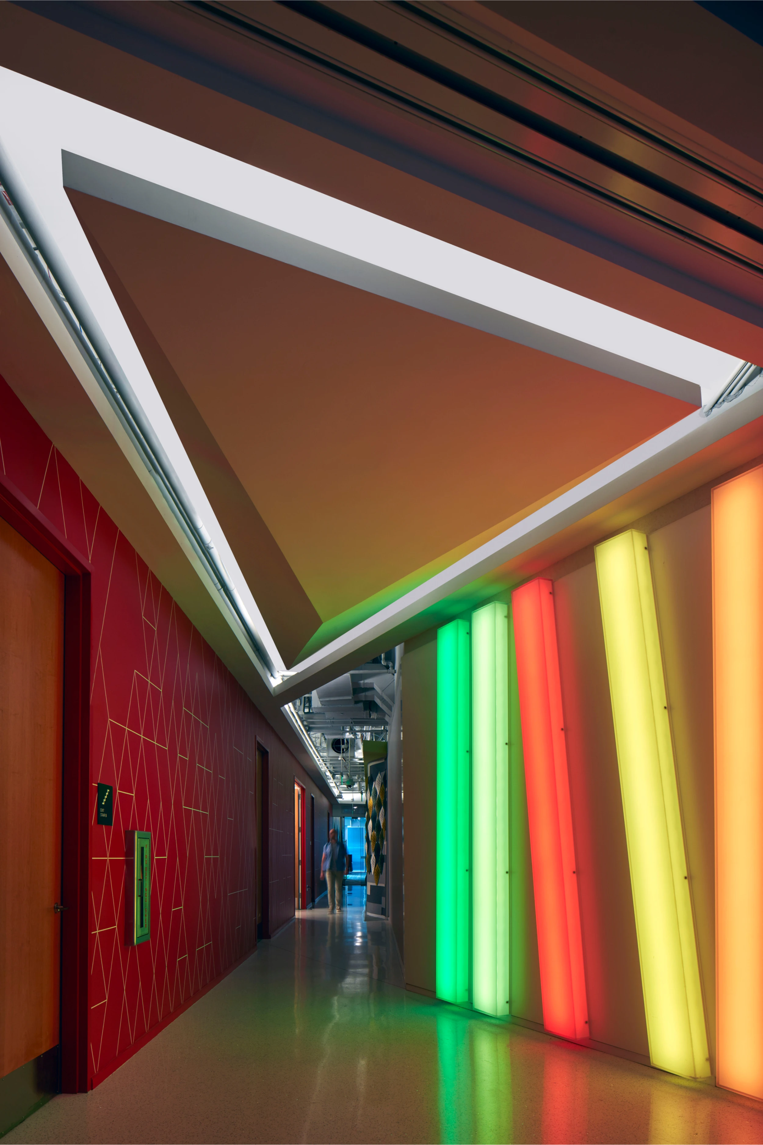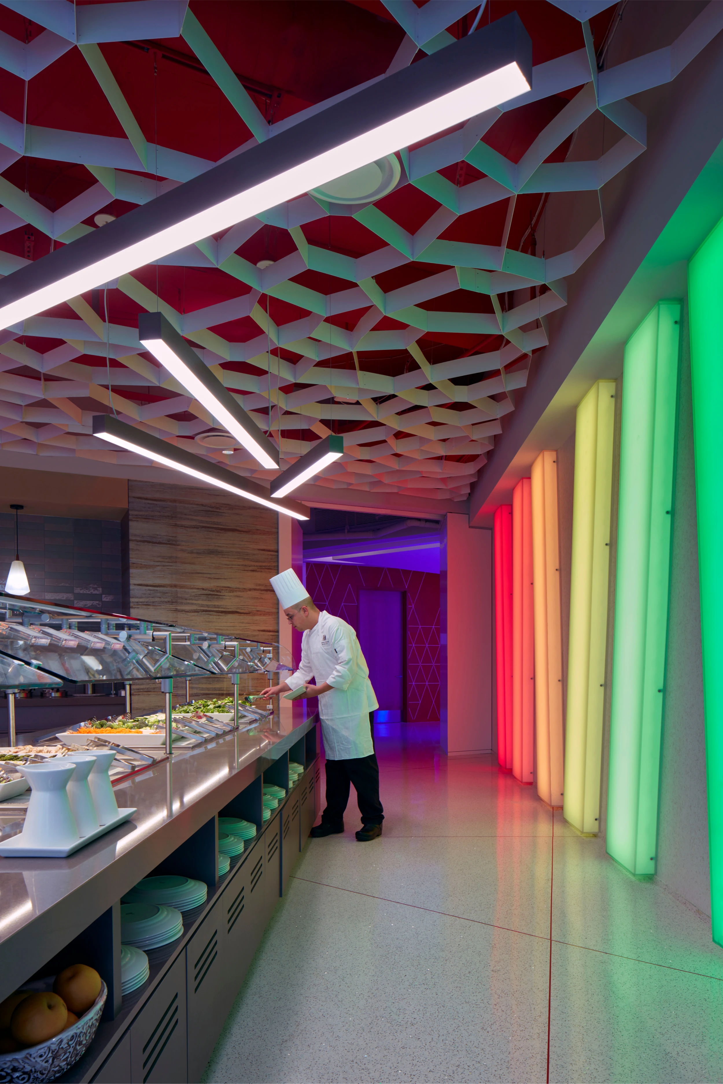 To align with the office’s high-end finishes while withstanding heavy traffic, creative solutions for flooring, wall treatments, and LED lighting were implemented. Comcast's commitment to employee satisfaction was evident in the phased project approach, ensuring staff had access to the dining facility from day one.