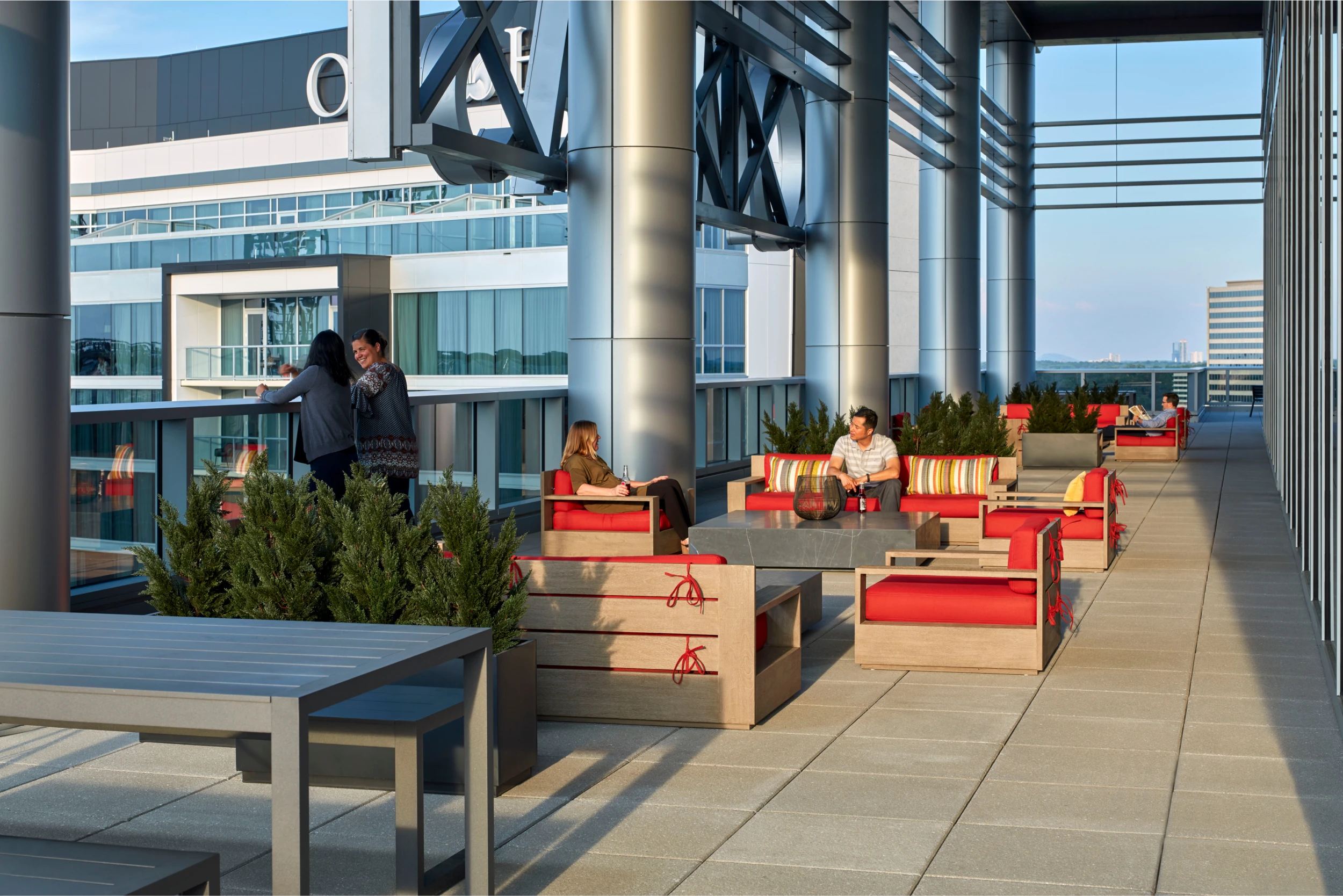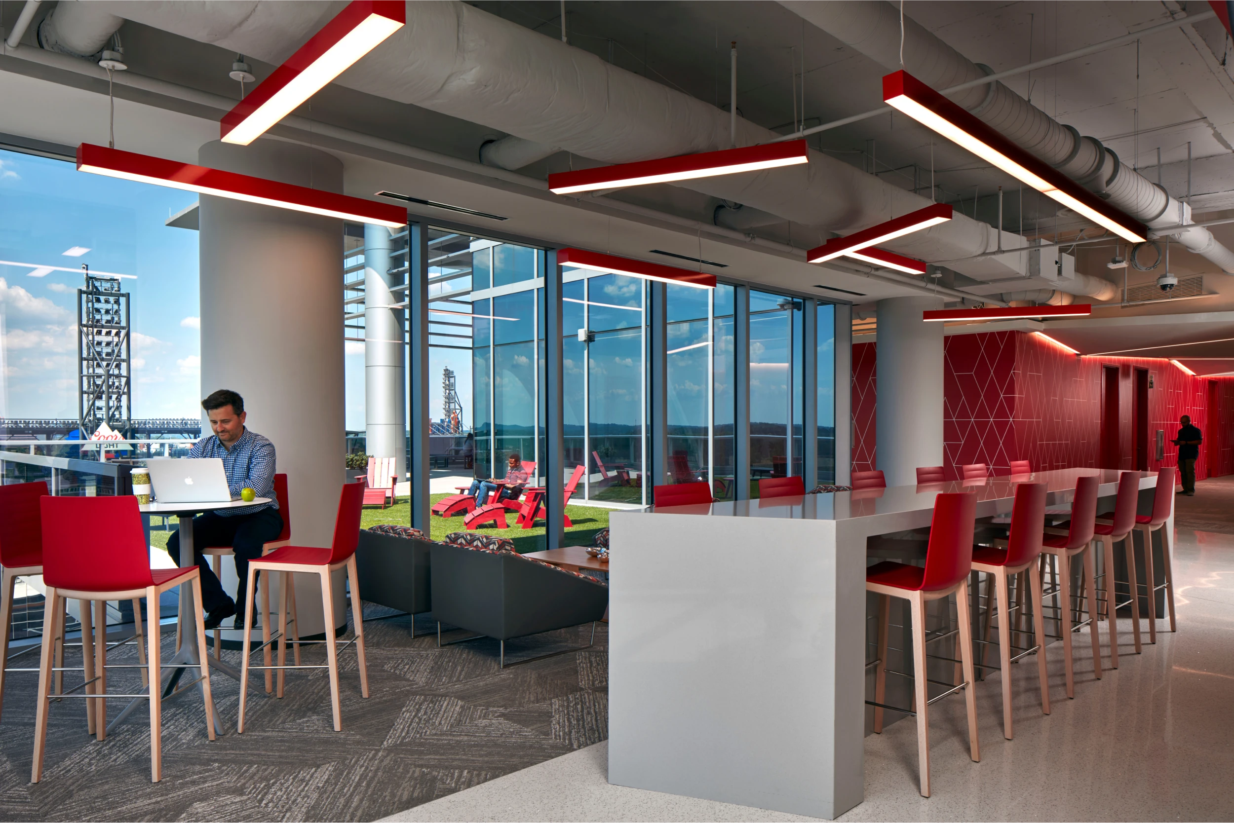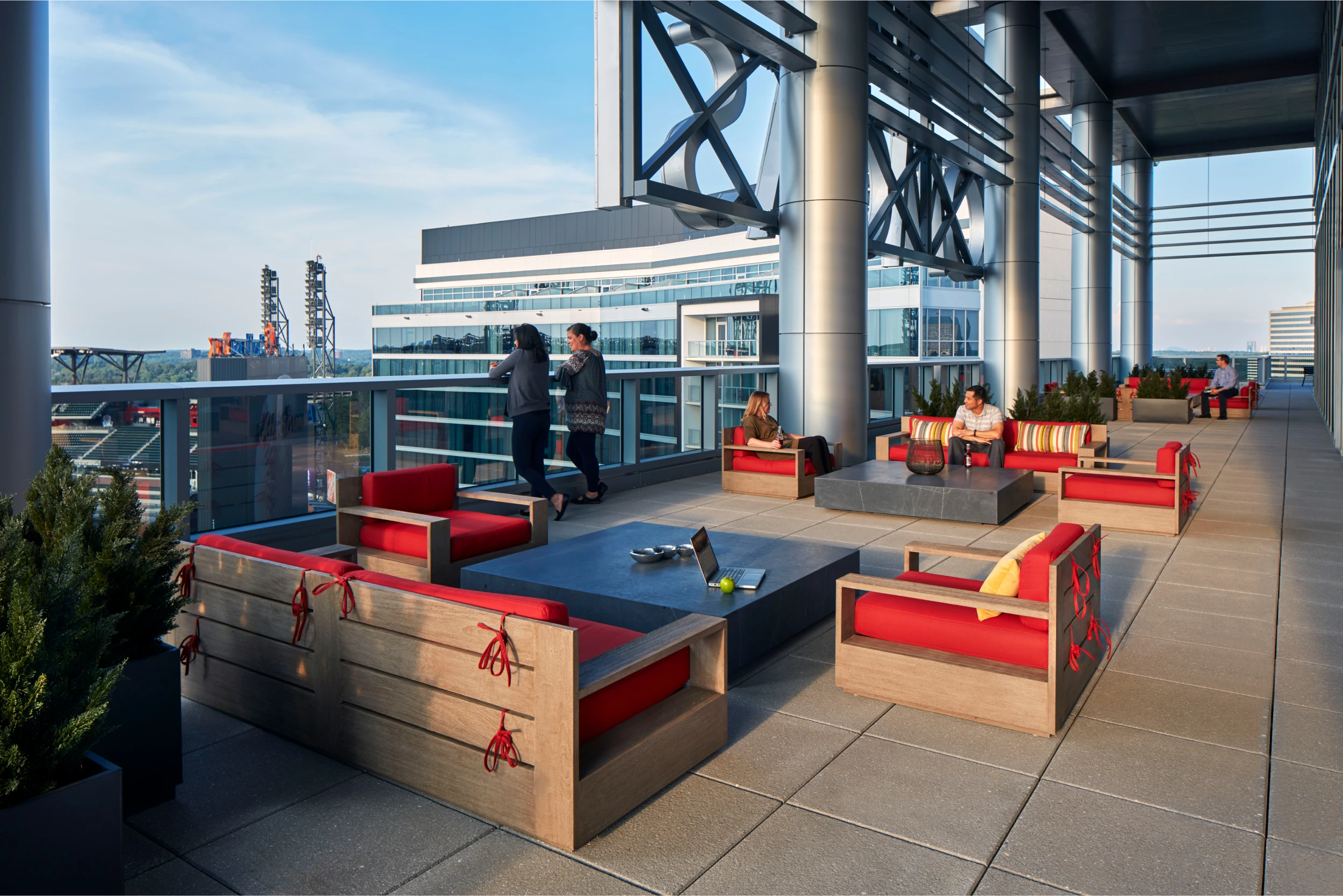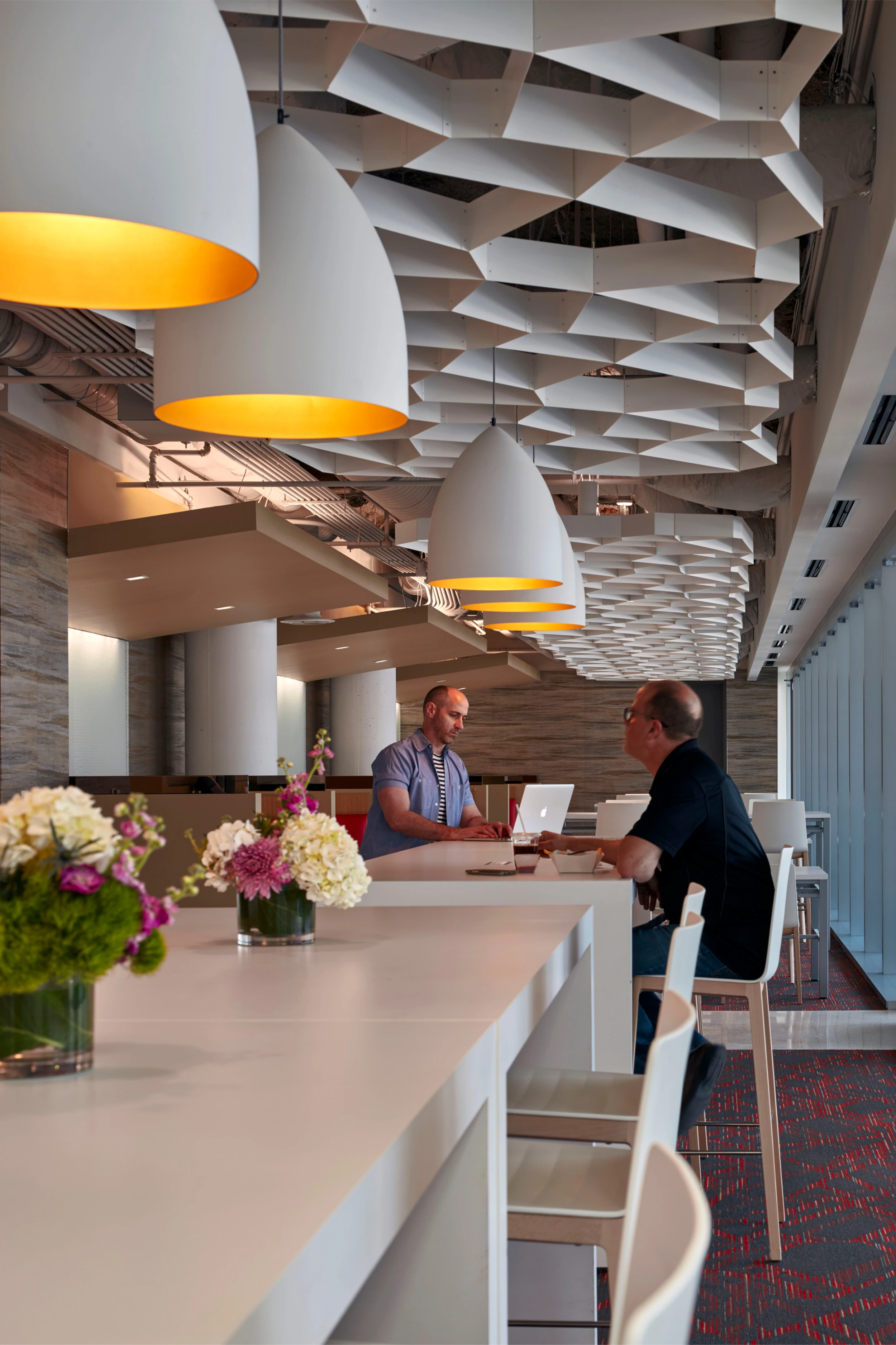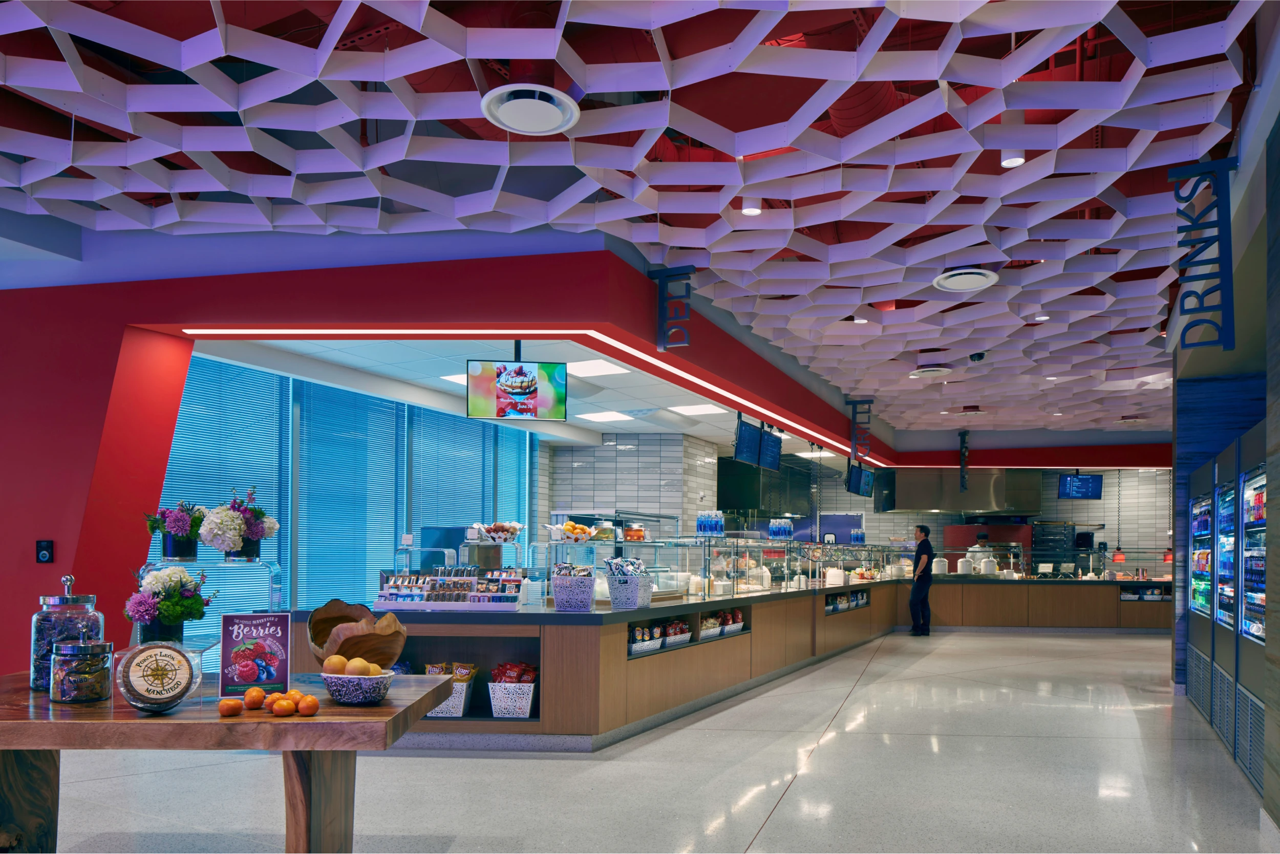 Comcast, a leader in multimedia technologies, prioritized employee well-being in the design of their new headquarters. The space features a full-service dining amenity connected to a large outdoor terrace overlooking Braves Field, offering multiple food stations and quick-grab options for over 350 employees daily.