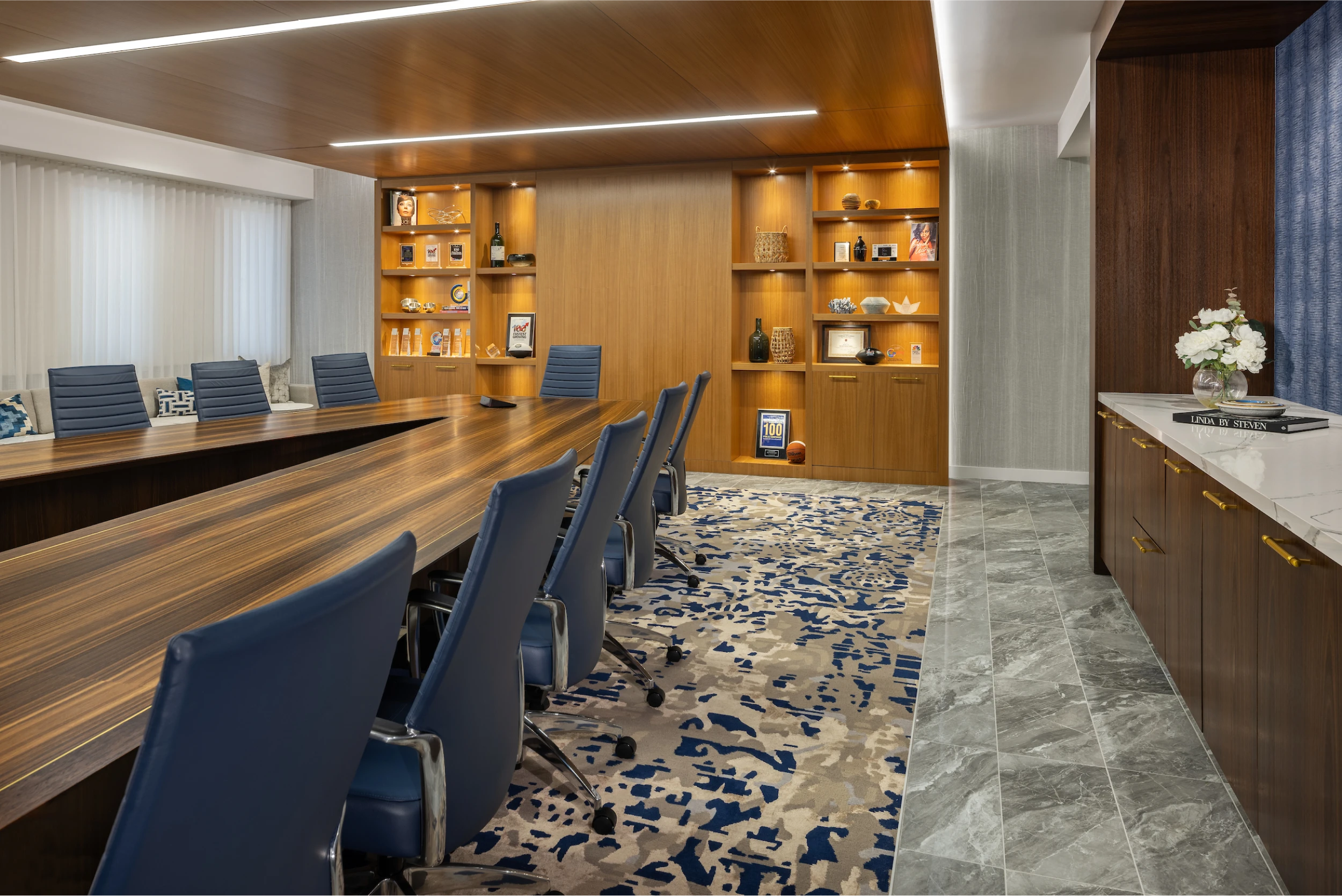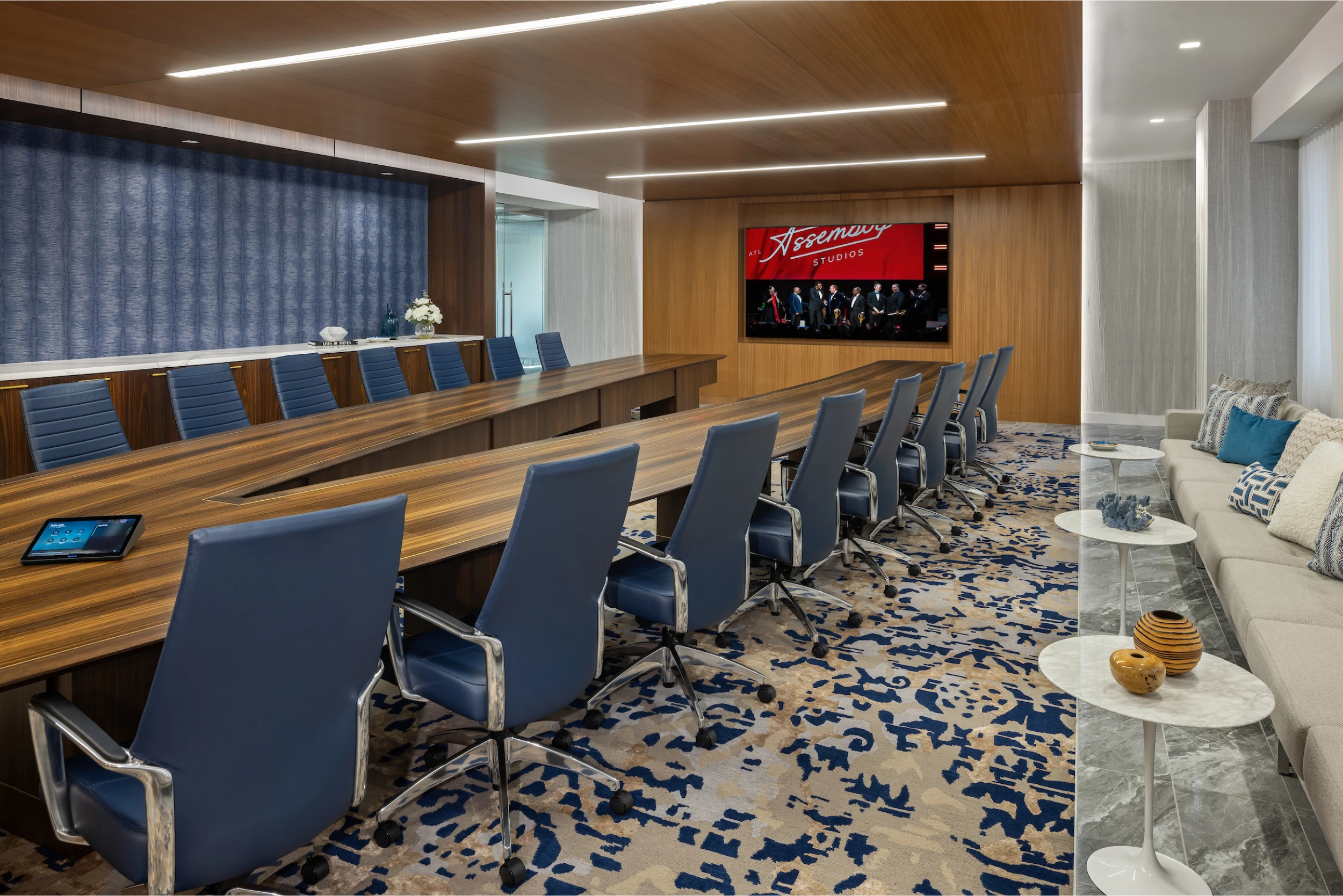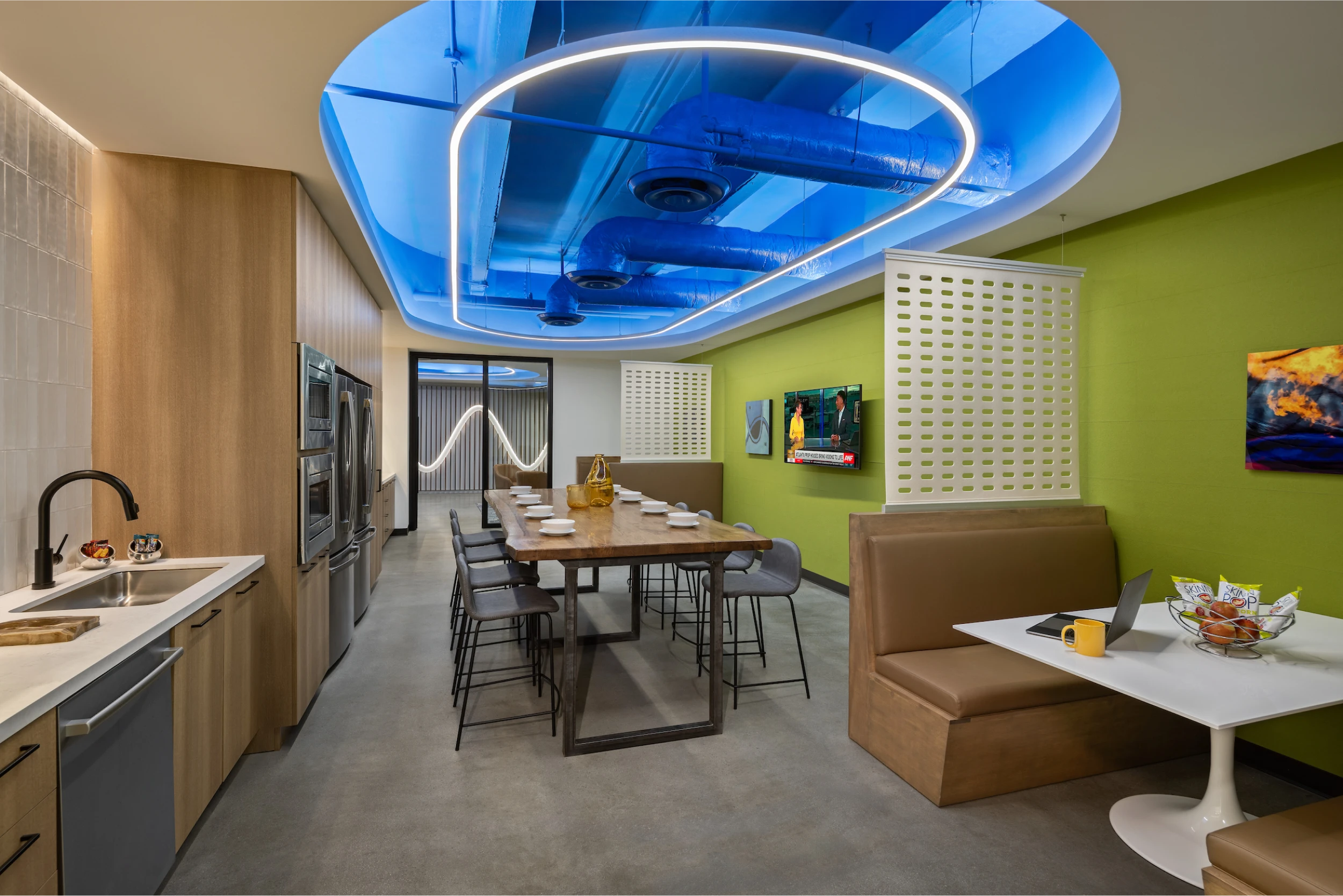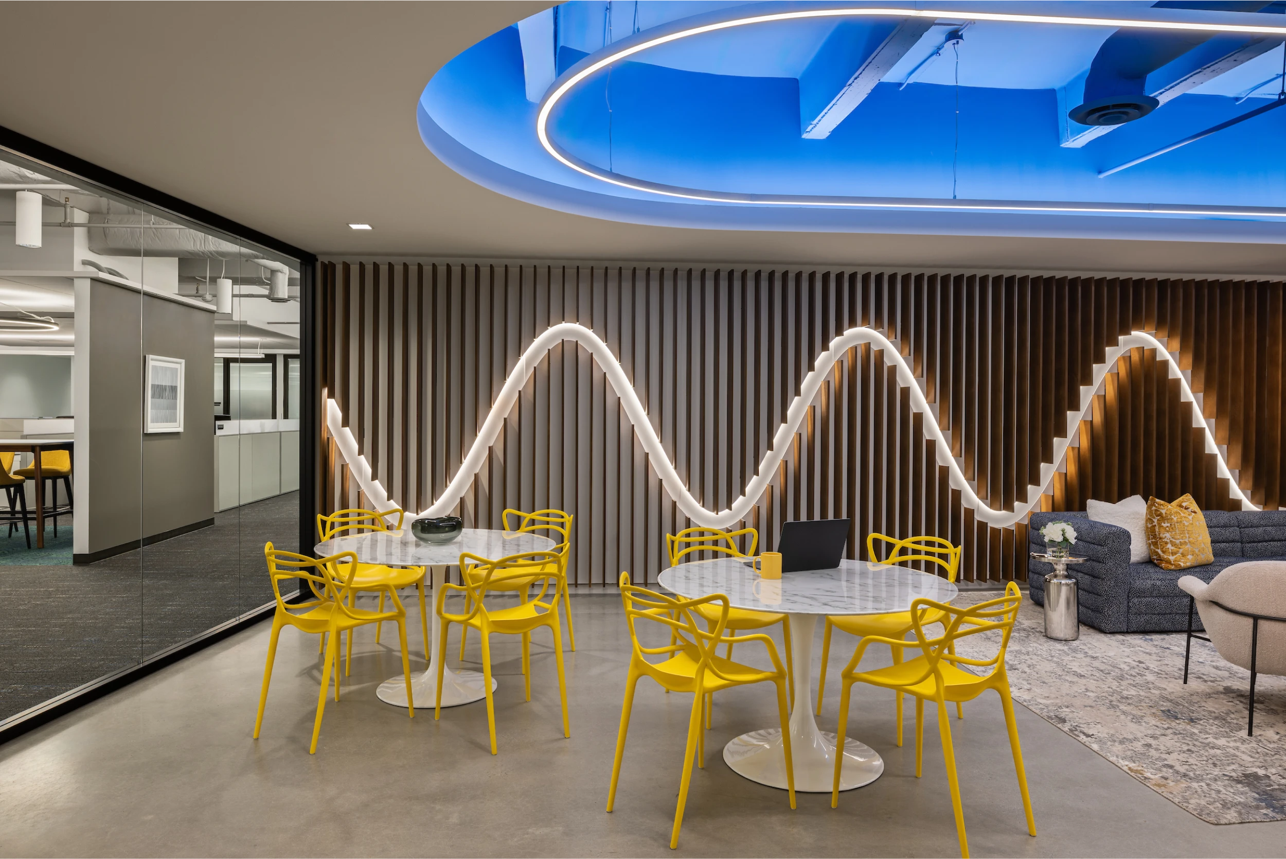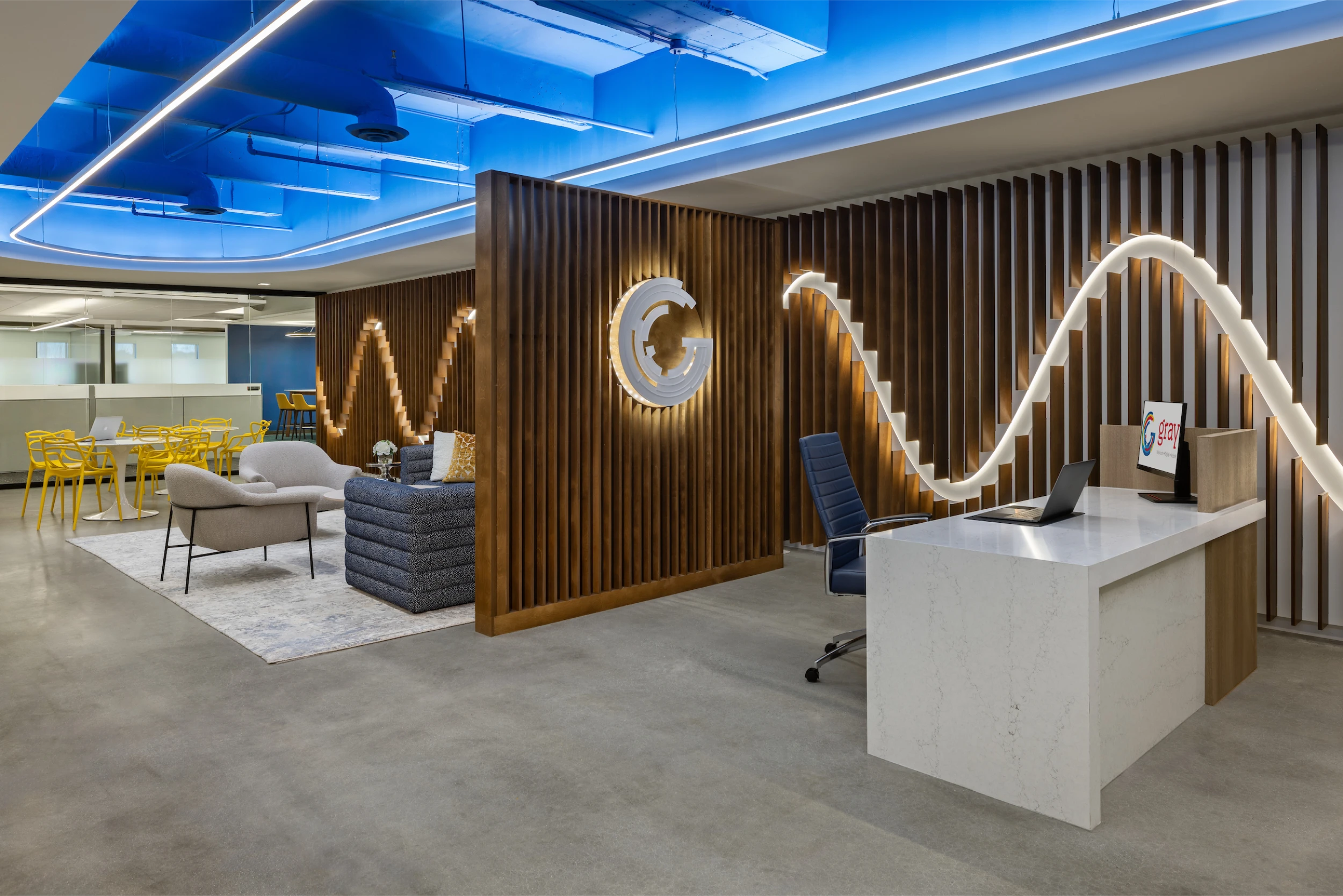 Gray TV, a leading media company with headquarters in Atlanta, sought a space that reflects the dynamic world of media and communication. The entry area mirrors a broadcast studio, complete with a client “Green Room,” setting the tone for innovation.