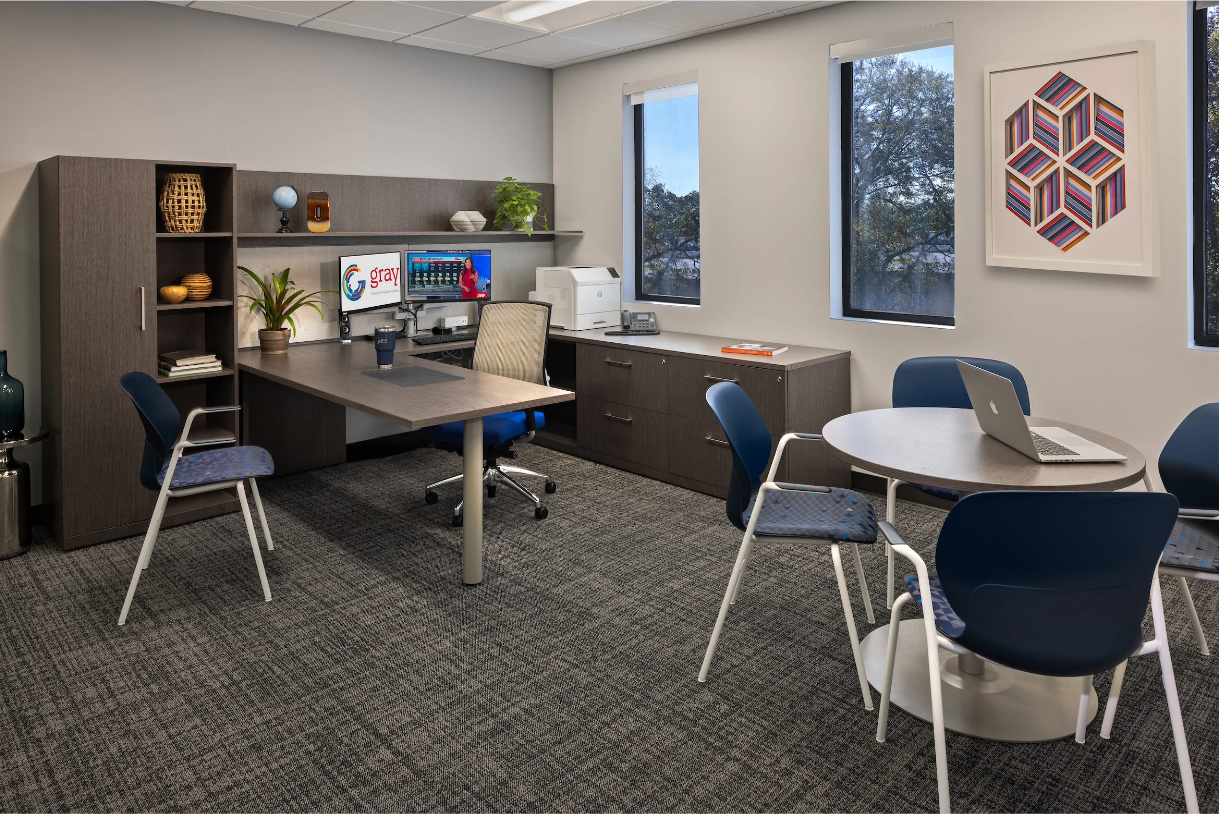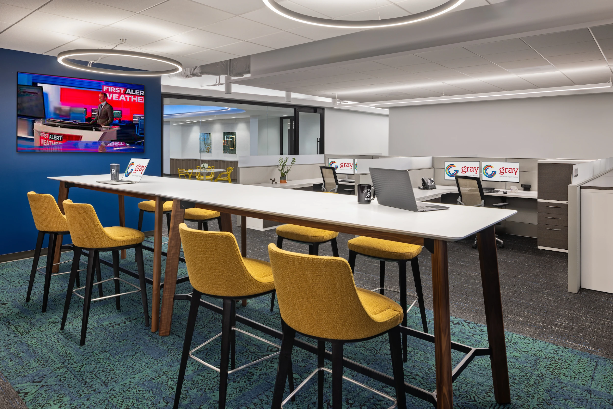 Hendrick designed an open, flexible workspace featuring demountable glass offices and adaptable furnishings, promoting communication and customization. The new office, along with a cutting-edge annex showcasing advanced technologies, energizes Gray TV’s ongoing expansion and acquisition of stations nationwide.