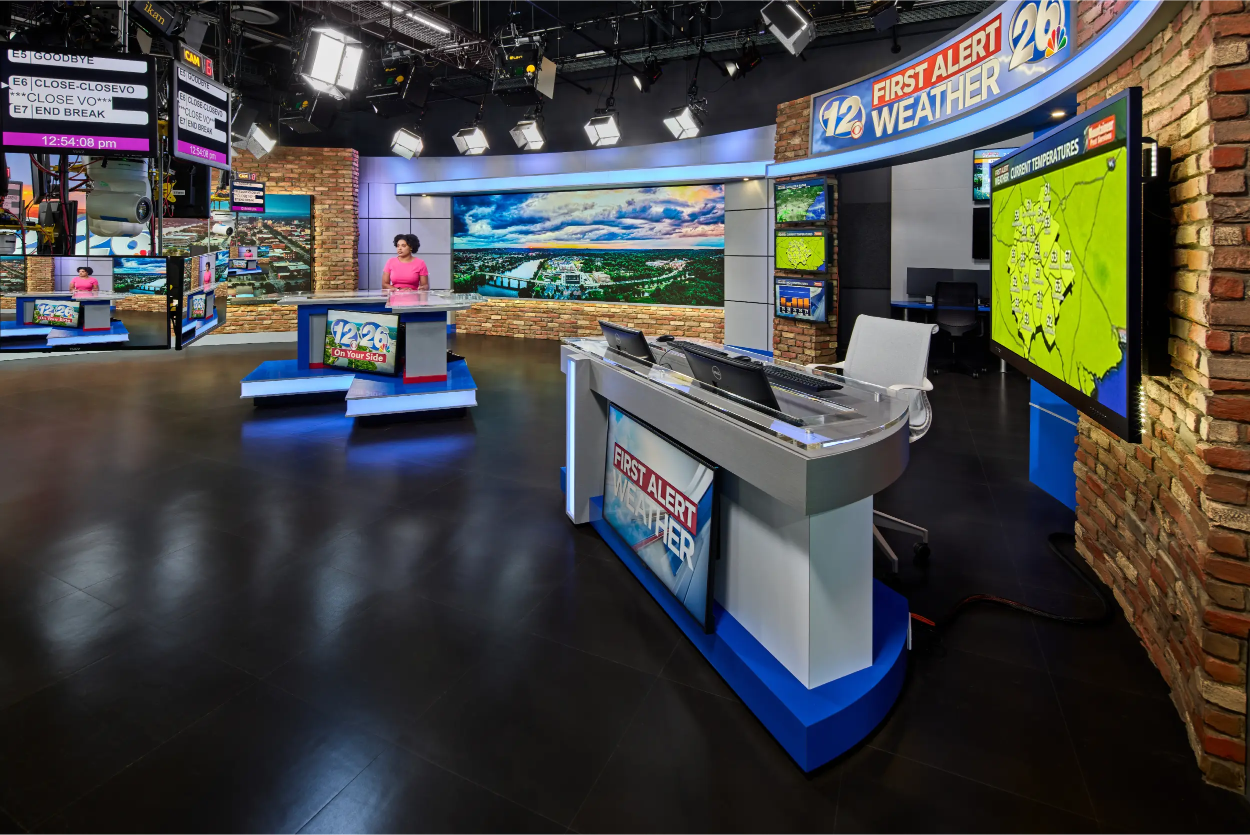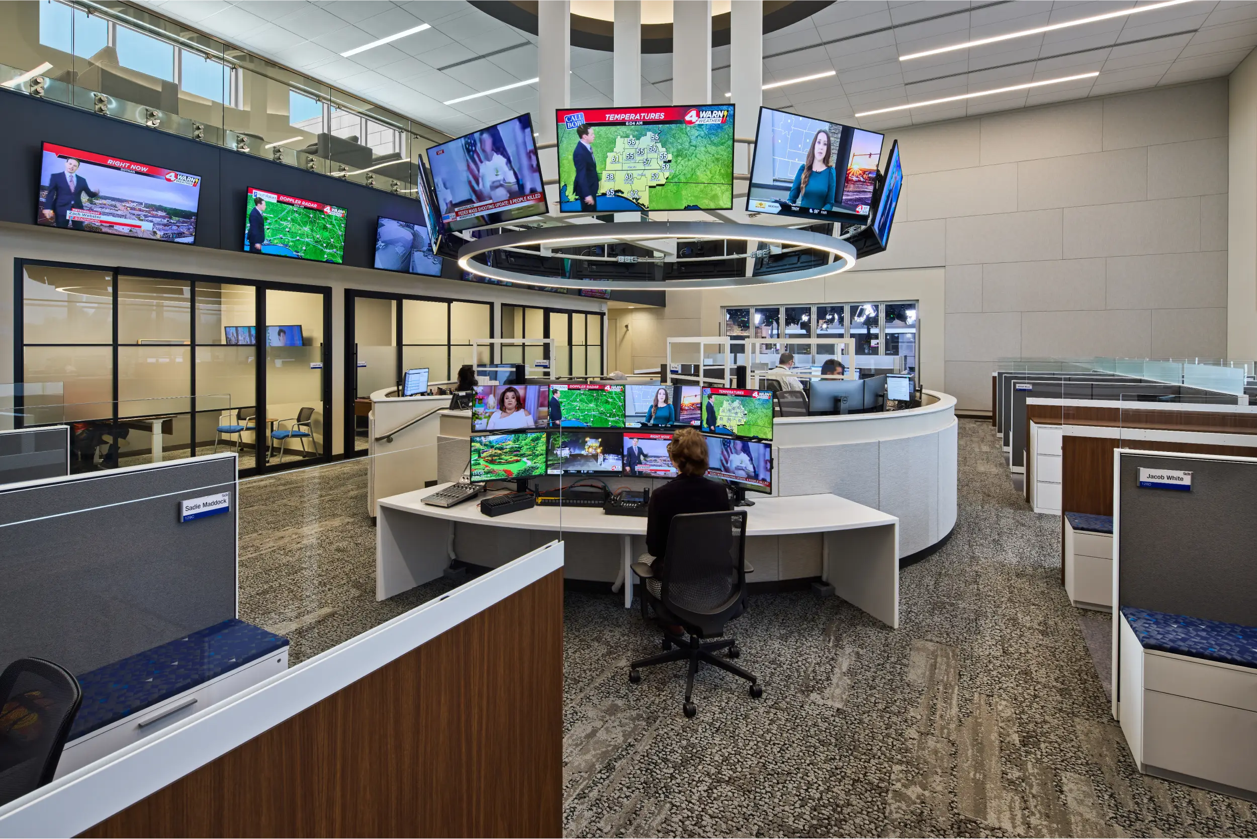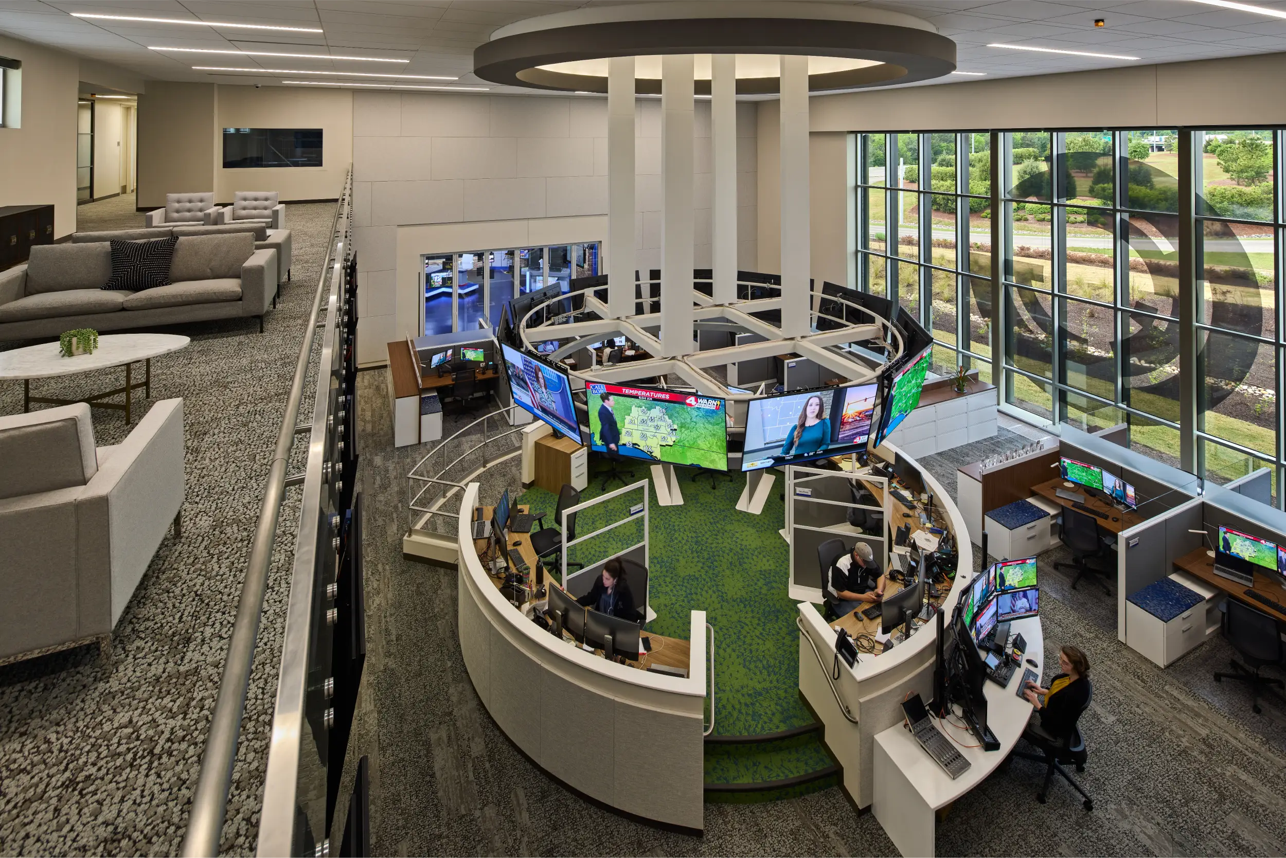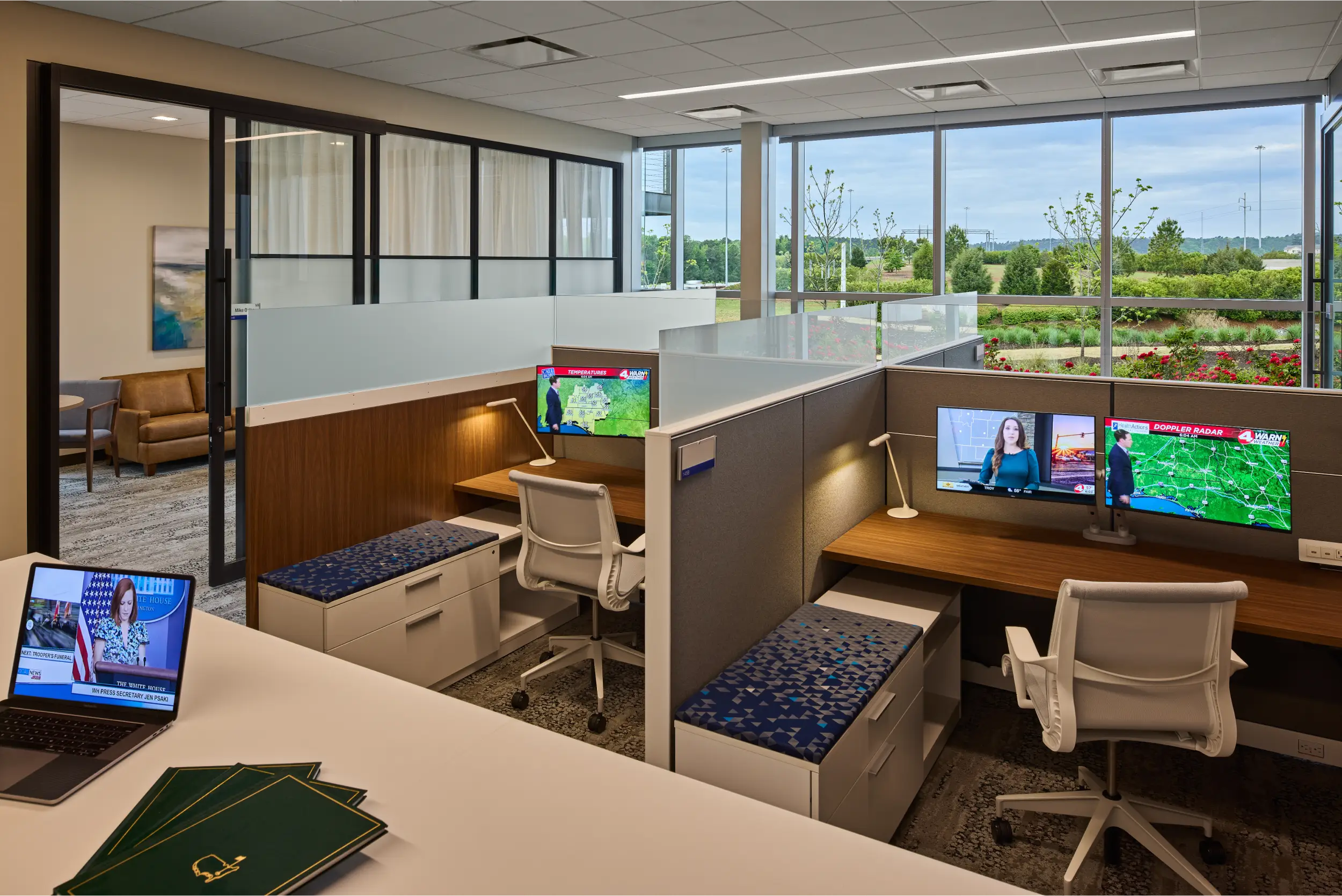 Gray TV’s new station in Augusta, Georgia, is a state-of-the-art broadcast facility. WRDW’s cutting-edge technology has made it the premier station in the region, playing a vital role in the surrounding communities. The functionality of the new station is housed in a familiar aesthetic that is relaxed and rooted in the vernacular of the area. The openness to nature and the textures of the finishes and furnishings create a sense of familiarity and comfort that reflects Augusta. On-site amenities provide employees with outdoor spaces and a fitness center to promote both mental and physical well-being.