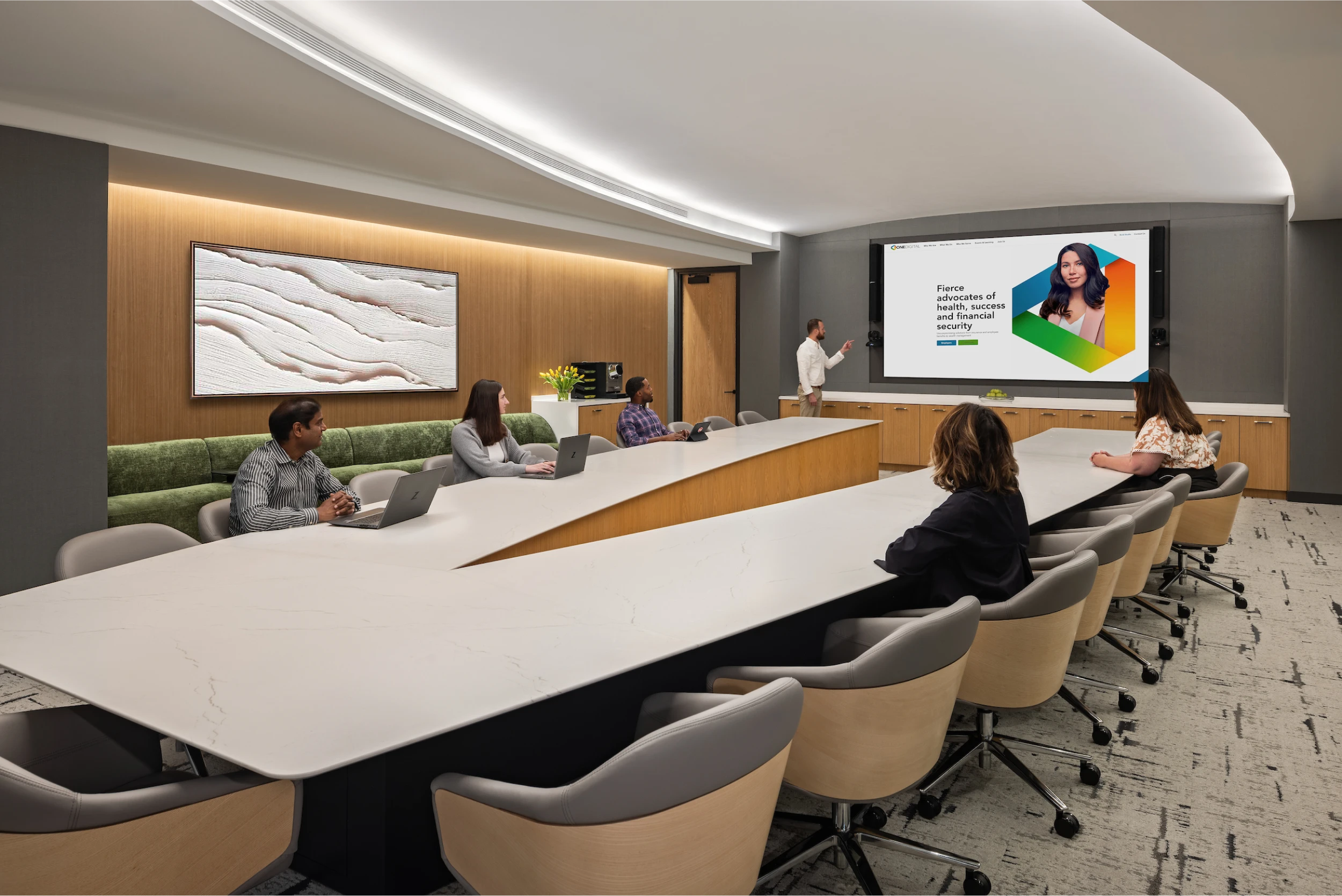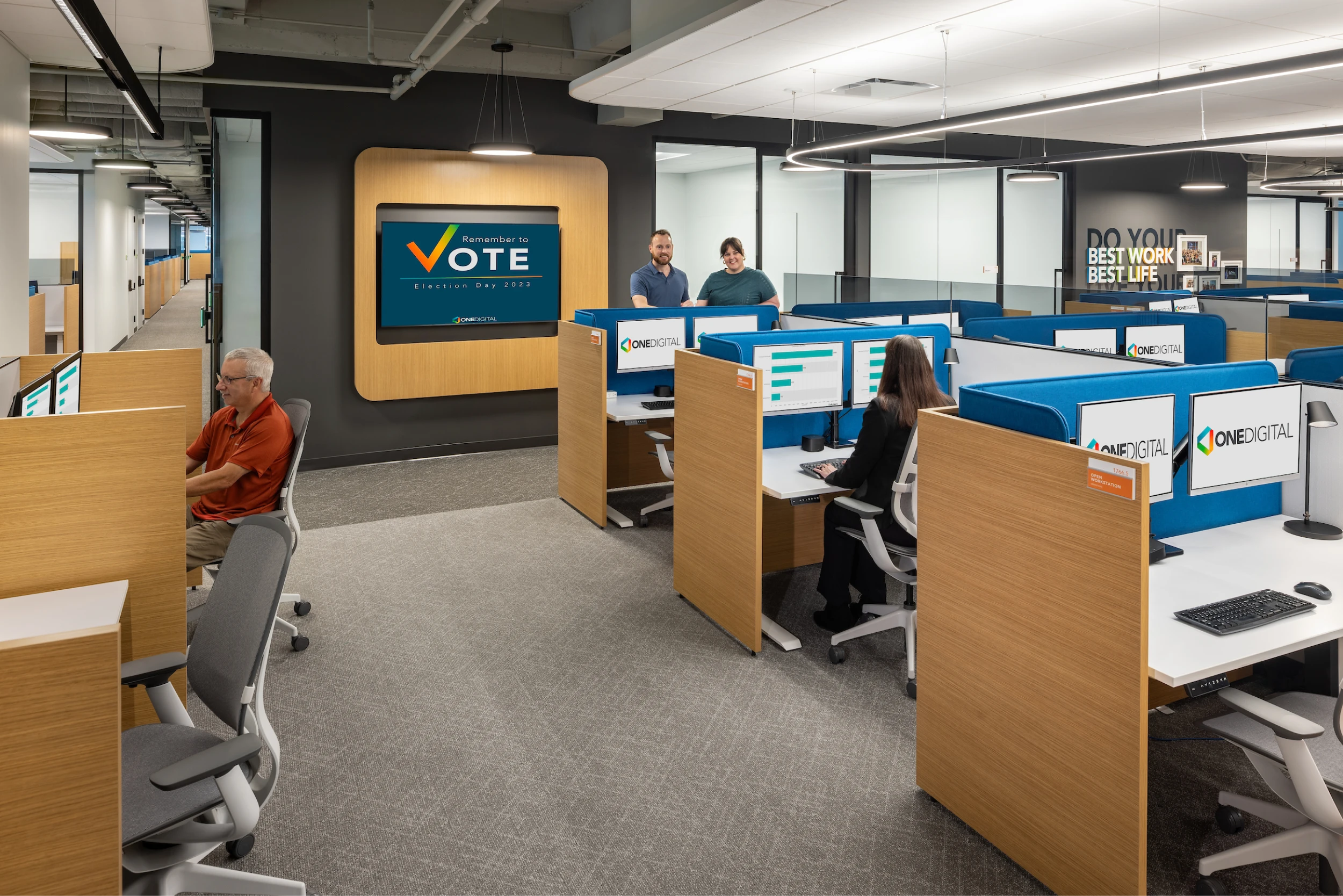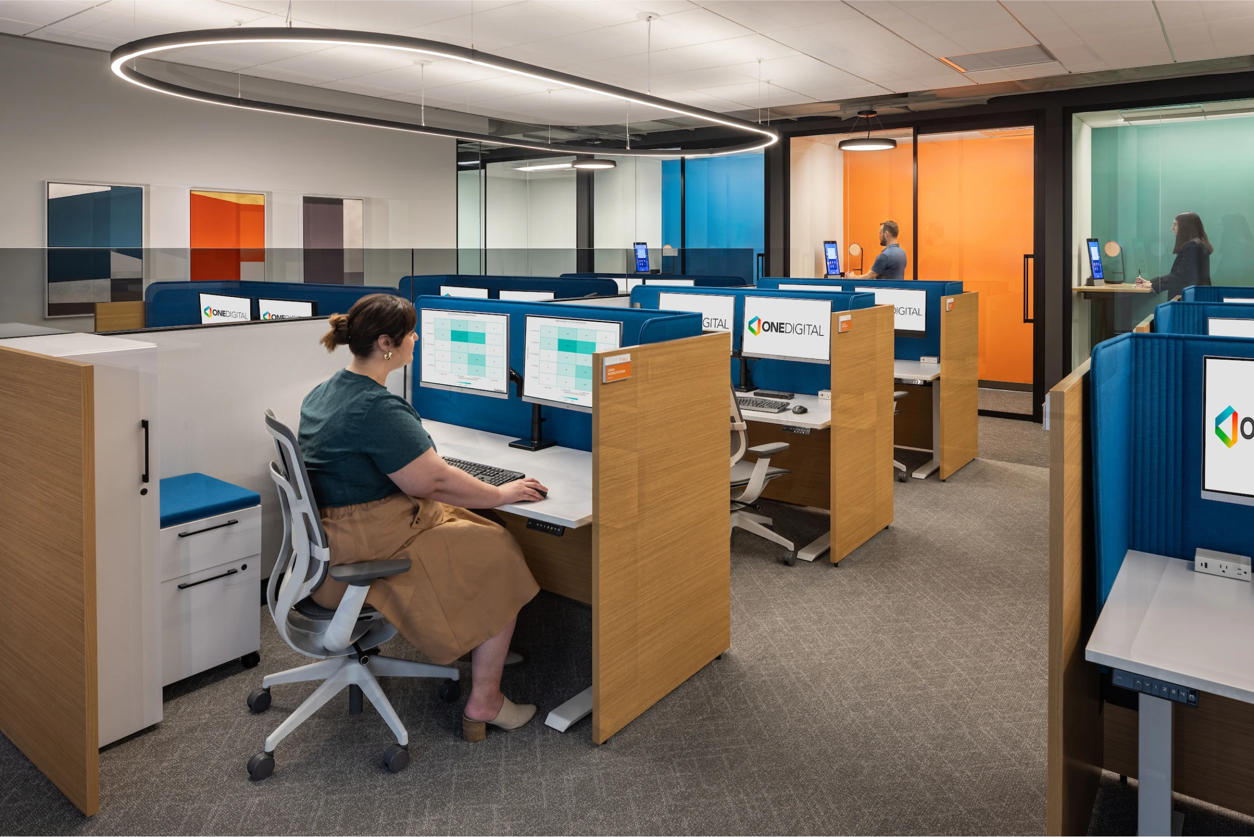 Flexible, multi-use spaces were created to adapt to various functions, enhancing efficiency and fostering engagement. With a neutral backdrop, warm tones, subtle branding, and dynamic lighting, the design offers a welcoming and productive environment, reinforcing OneDigital’s commitment to innovation and employee well-being.