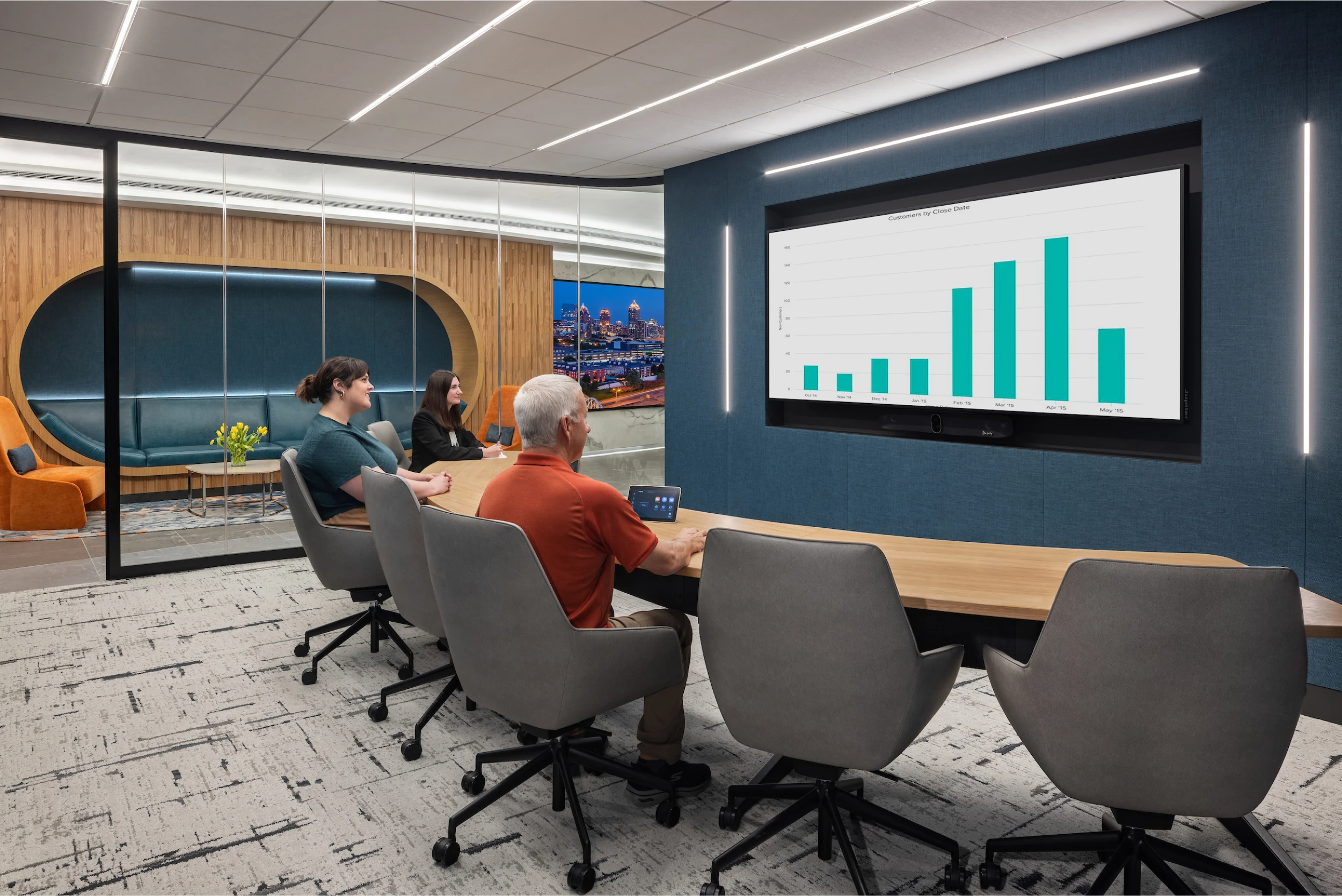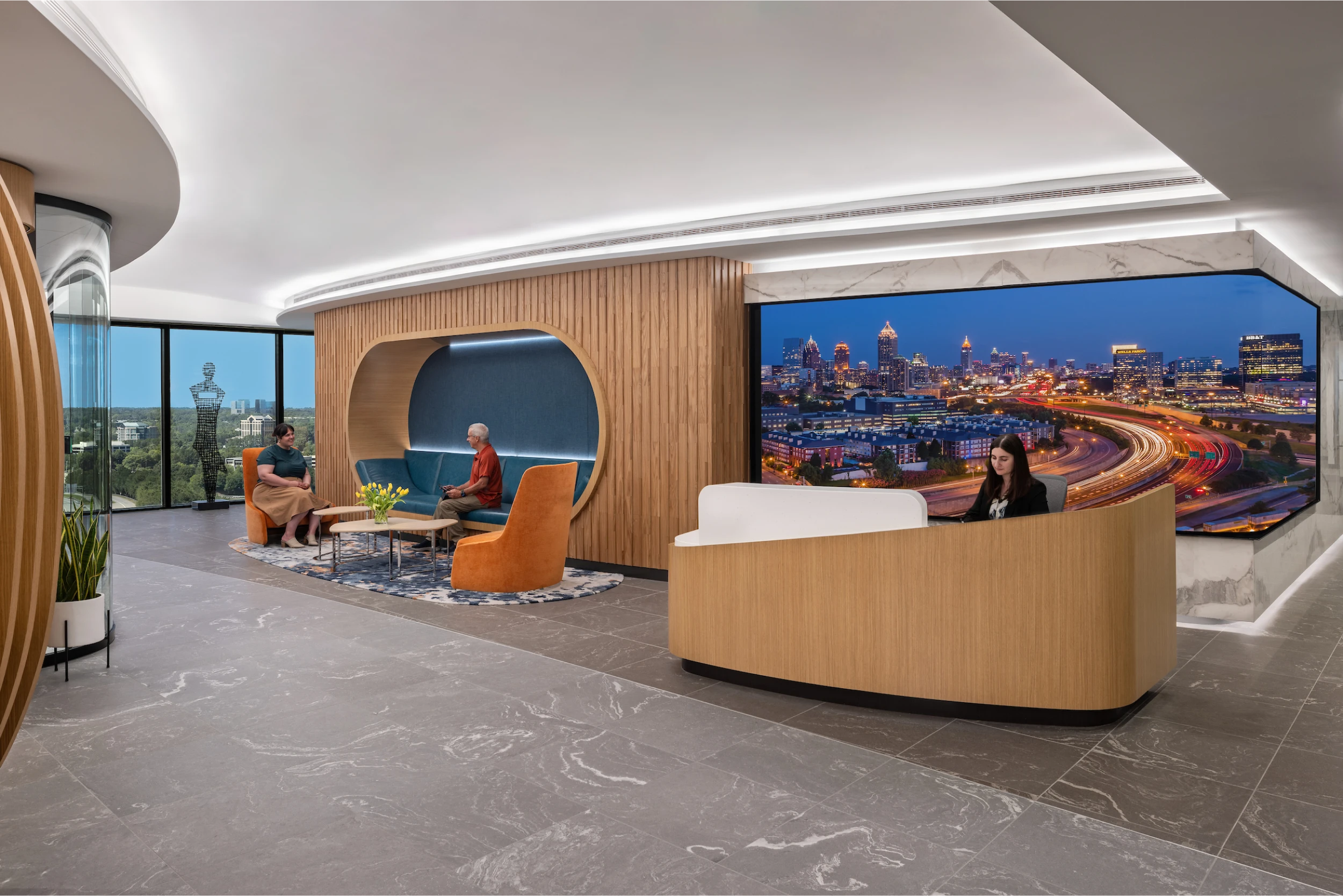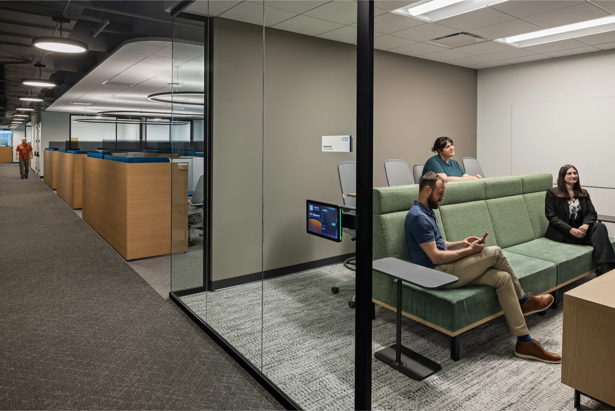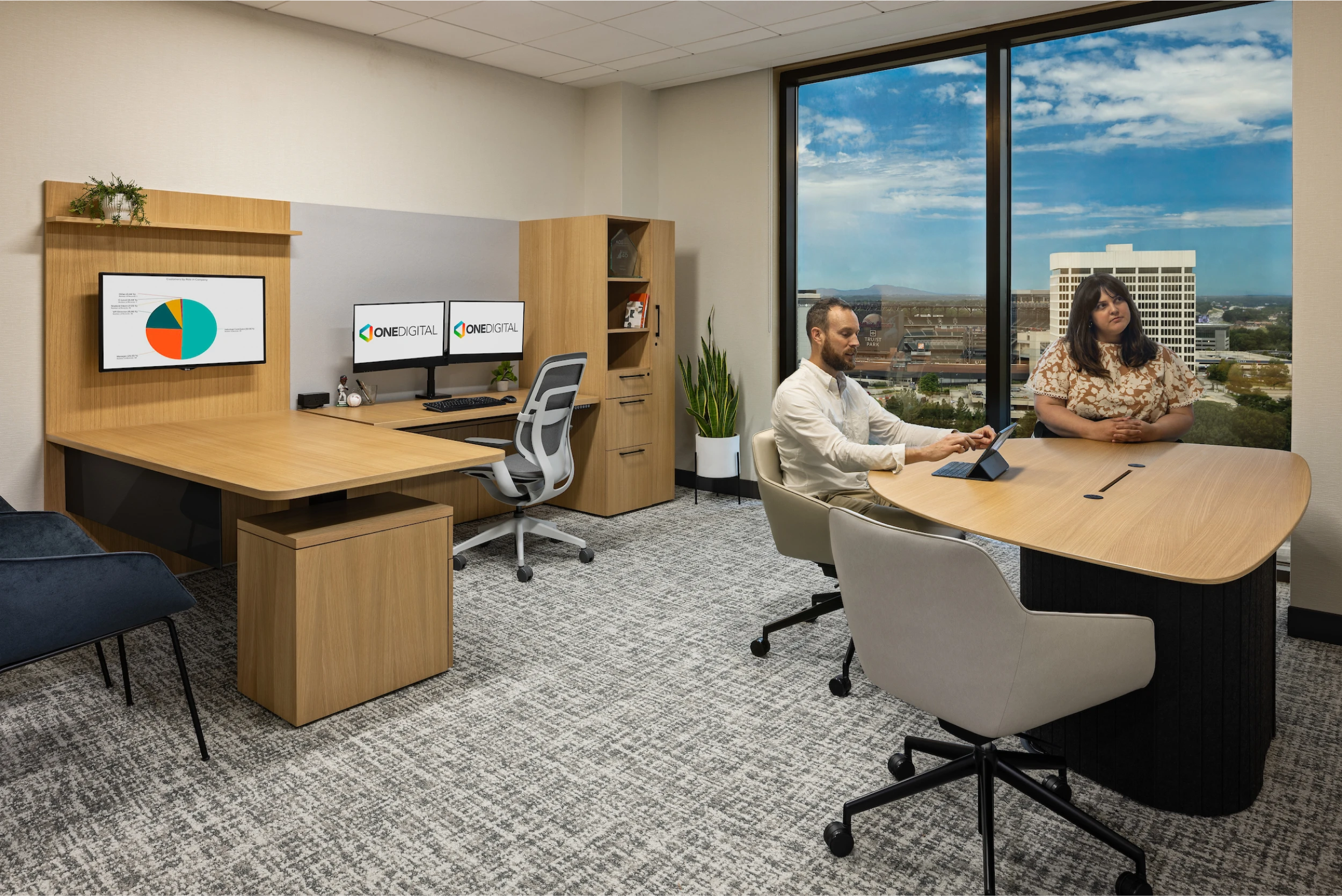 Flexible, multi-use spaces were created to adapt to various functions, enhancing efficiency and fostering engagement. With a neutral backdrop, warm tones, subtle branding, and dynamic lighting, the design offers a welcoming and productive environment, reinforcing OneDigital’s commitment to innovation and employee well-being.