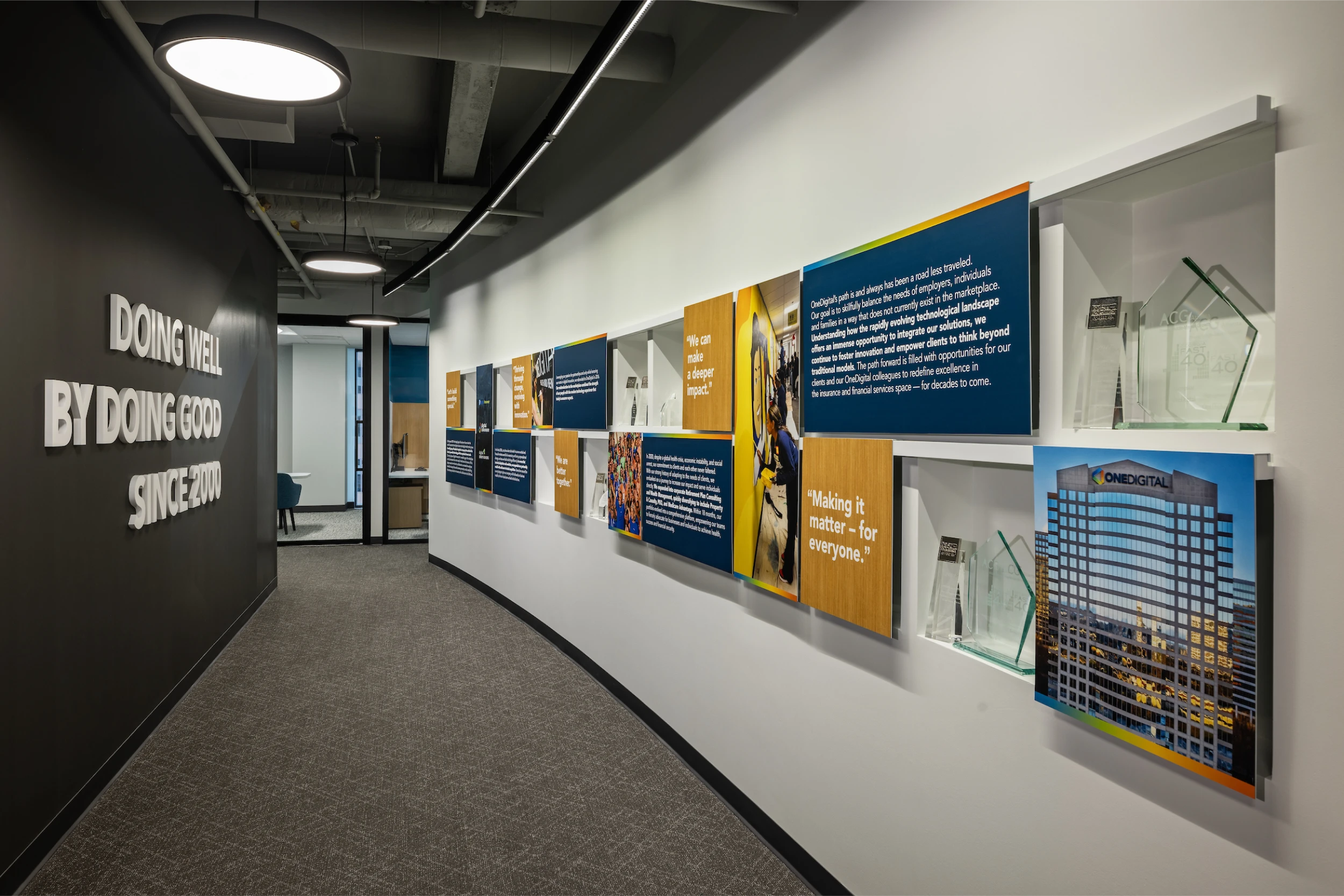 The transformation of OneDigital’s corporate headquarters and regional office highlights their growing national presence in the Insurance, Financial Services, and Human Resource sectors. This tech-forward, human-centric design emphasizes employee connections, collaboration, and a vibrant company culture.