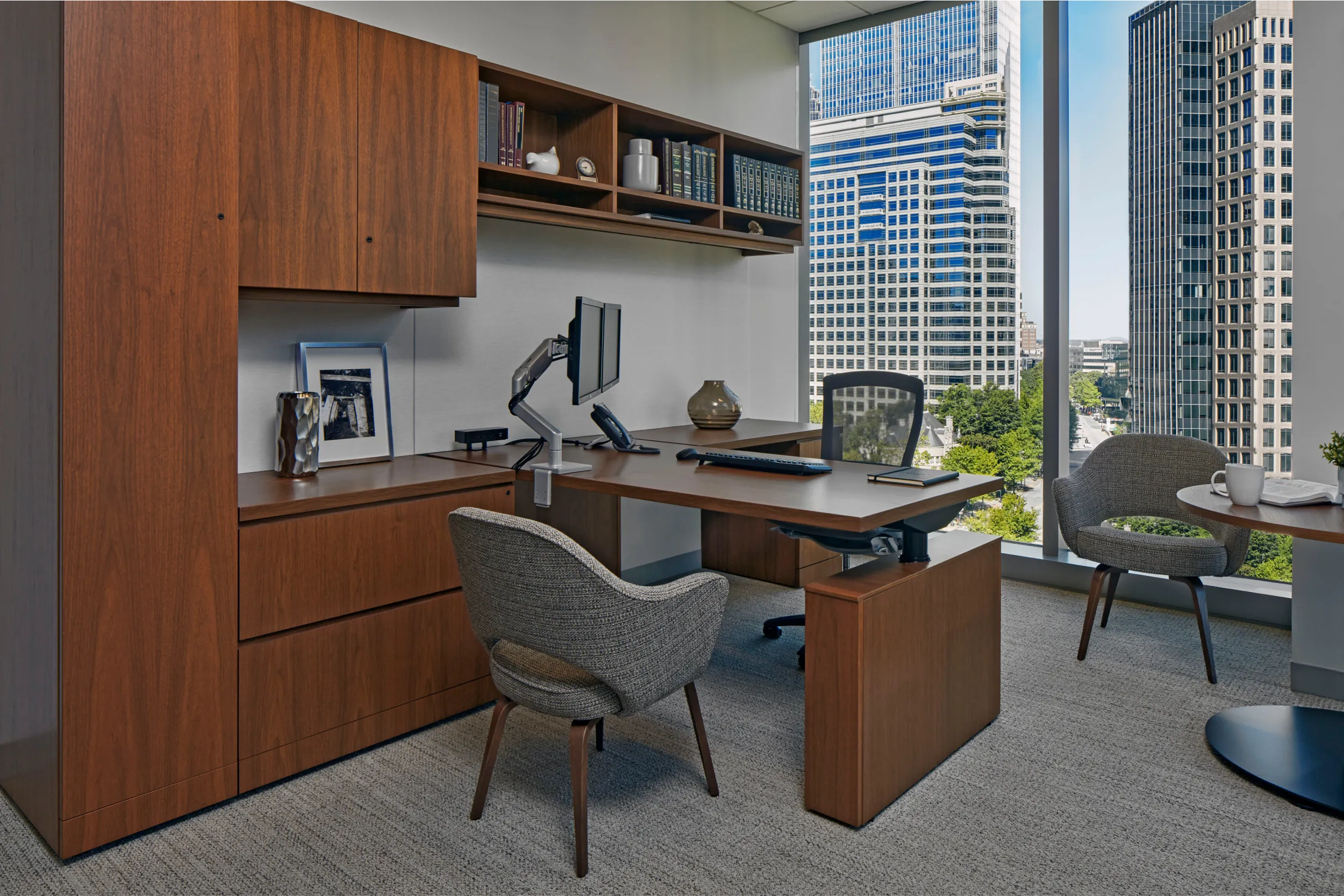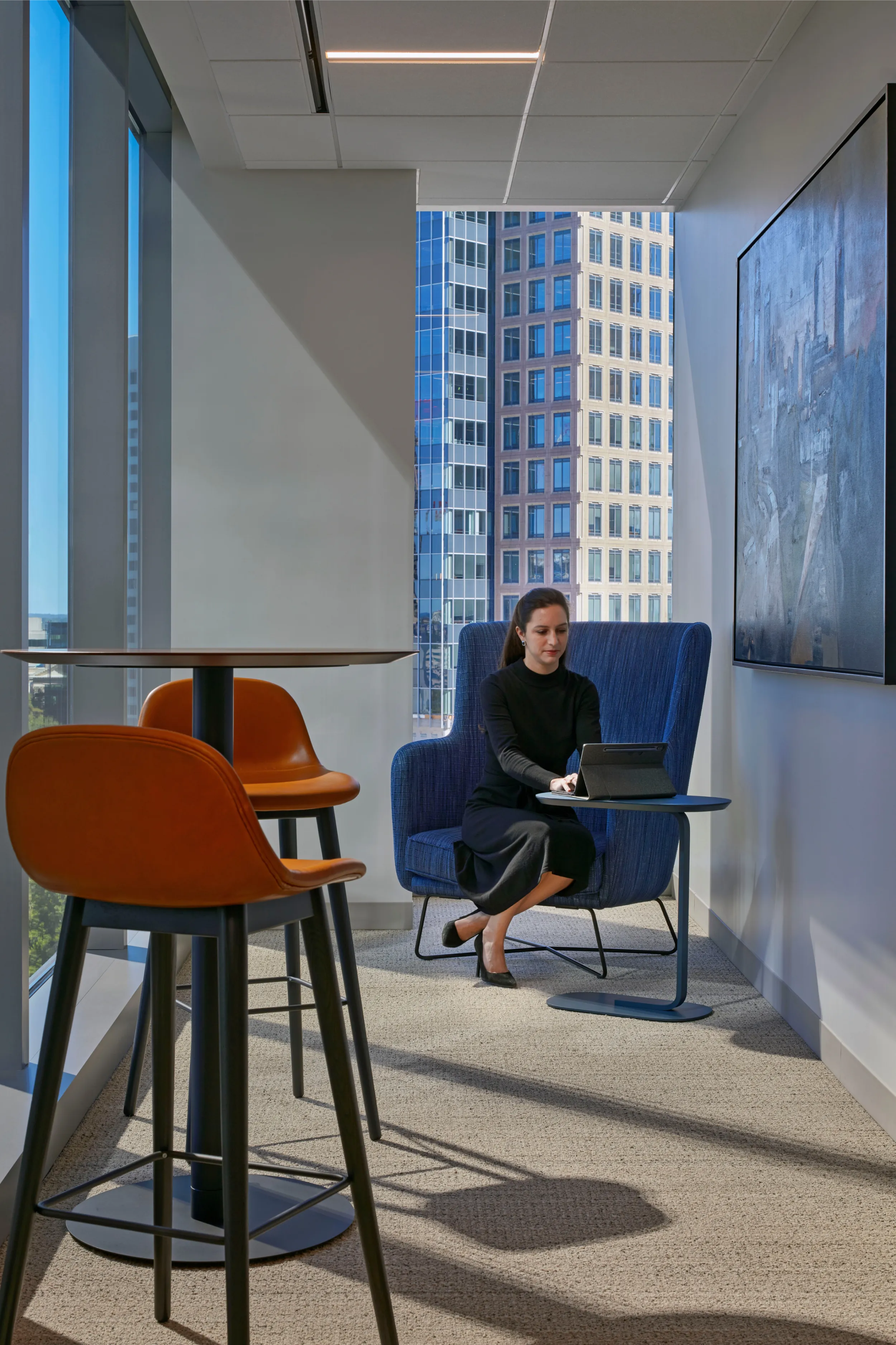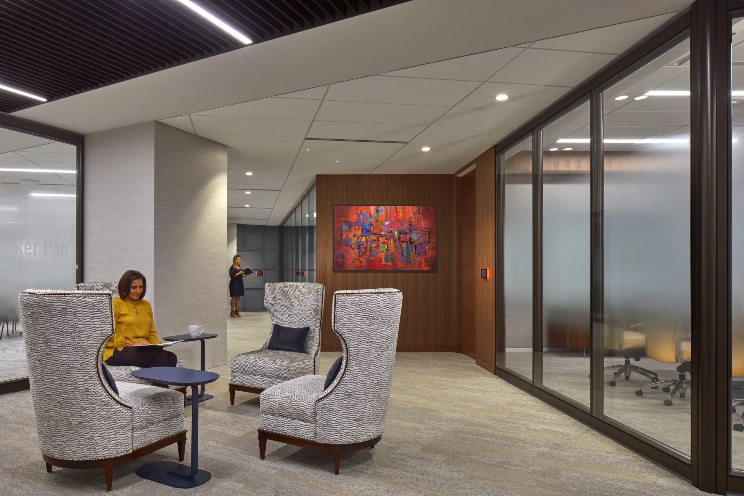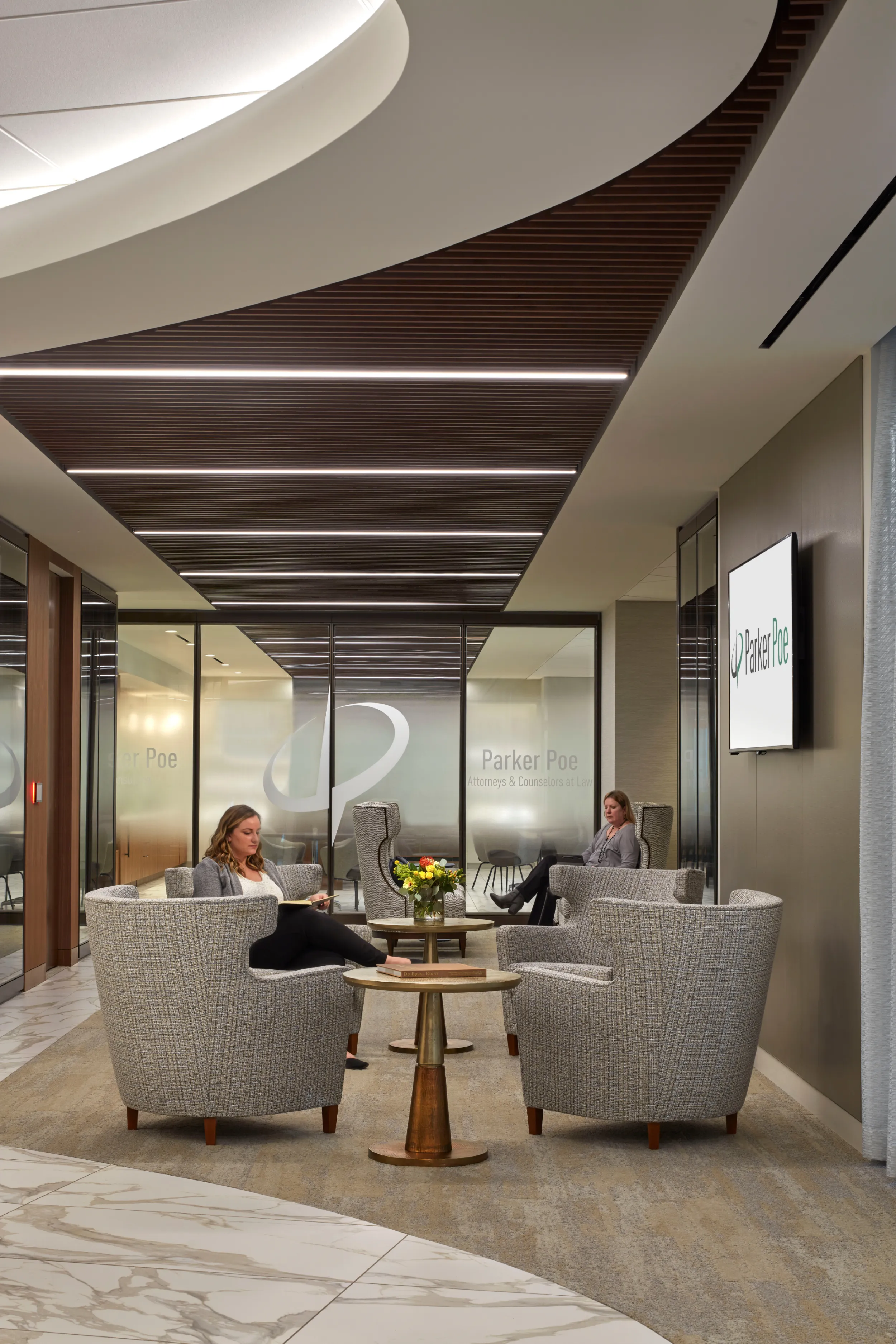The office design reflects Parker Poe's core values of client commitment, efficiency, and transparency. Clean lines, timeless materials, and welcoming textures create an environment that embodies the firm’s history and professionalism. The enhanced reception area and engaging workspaces foster meaningful connections, while branded elements throughout the space reinforce the firm’s strong identity.