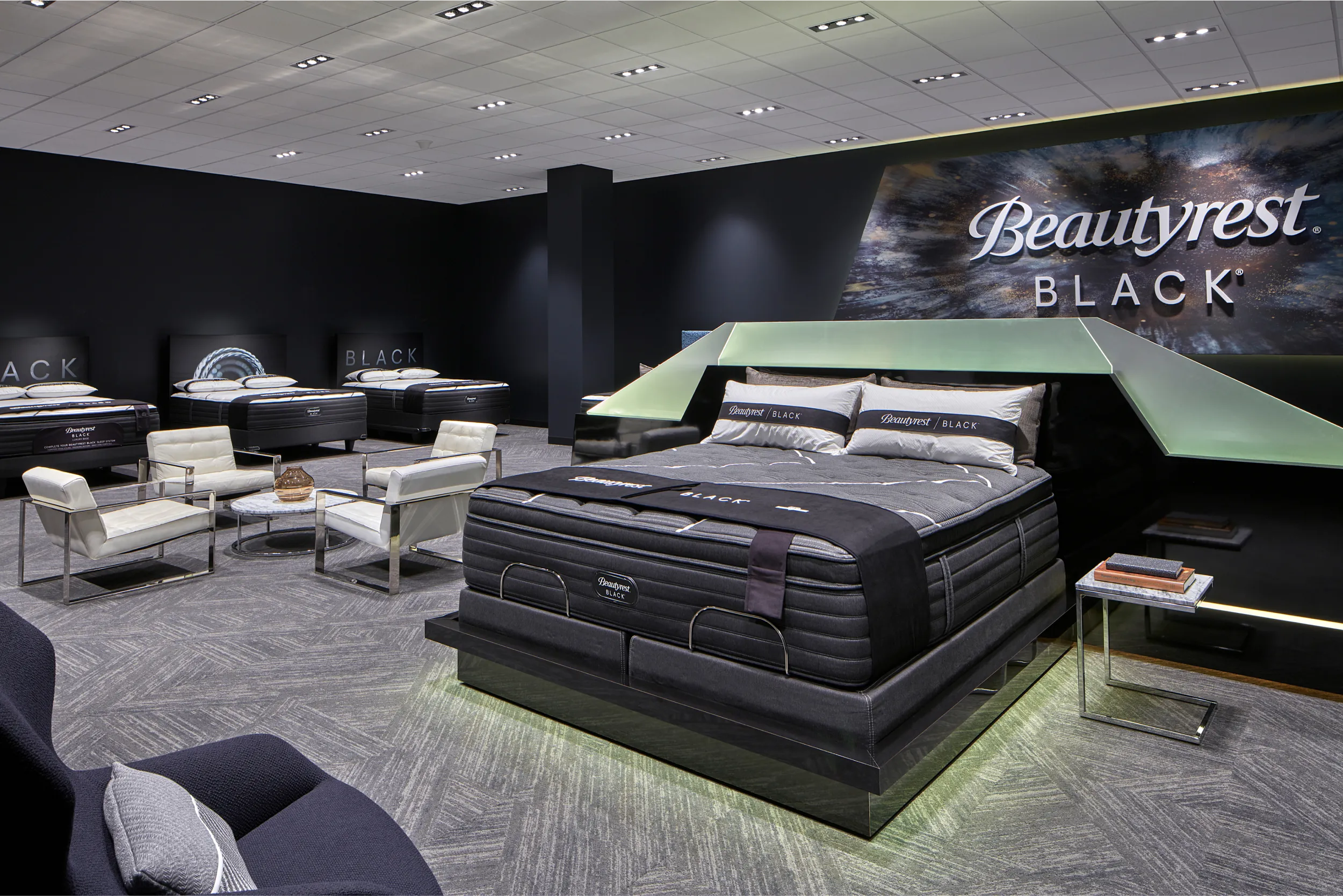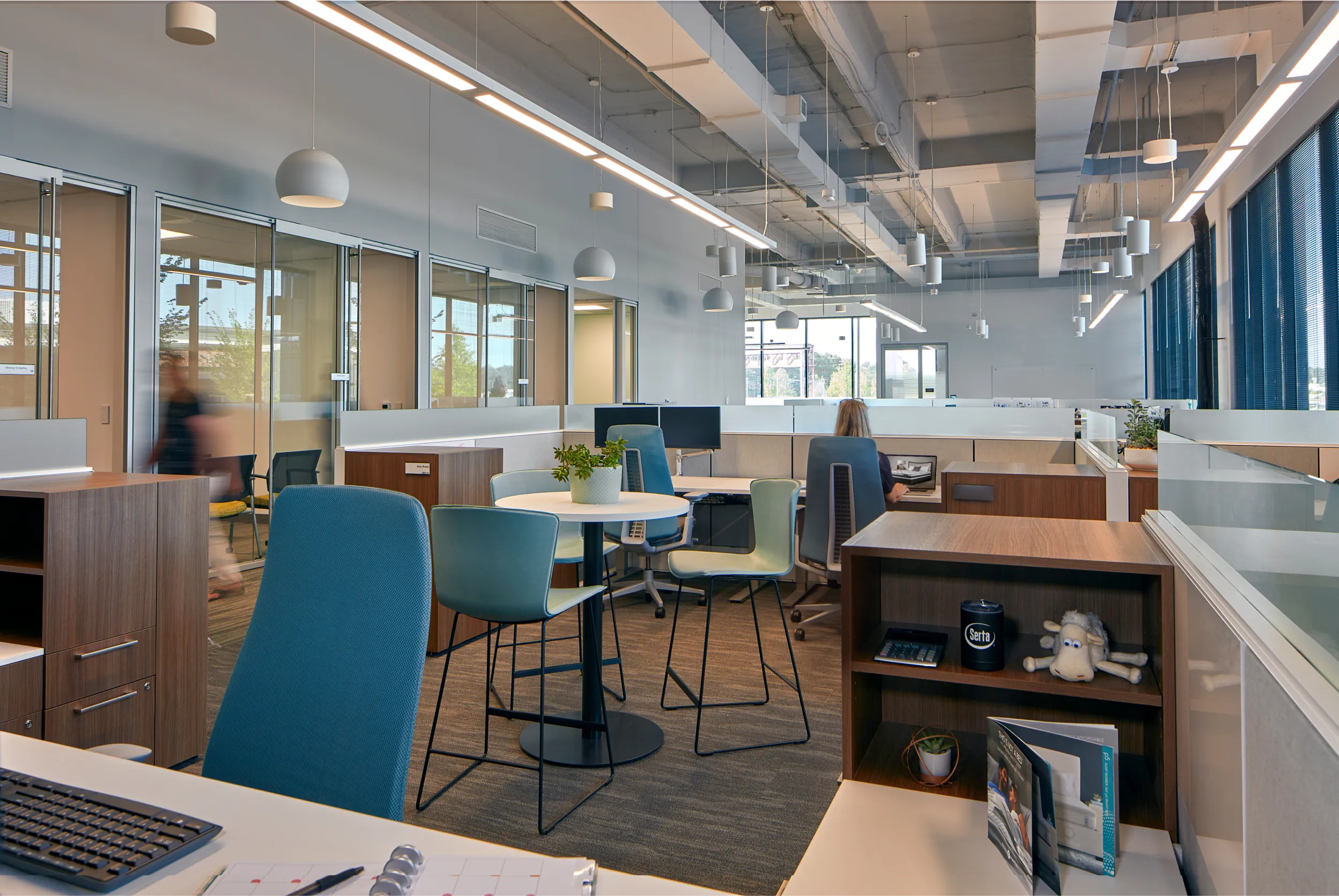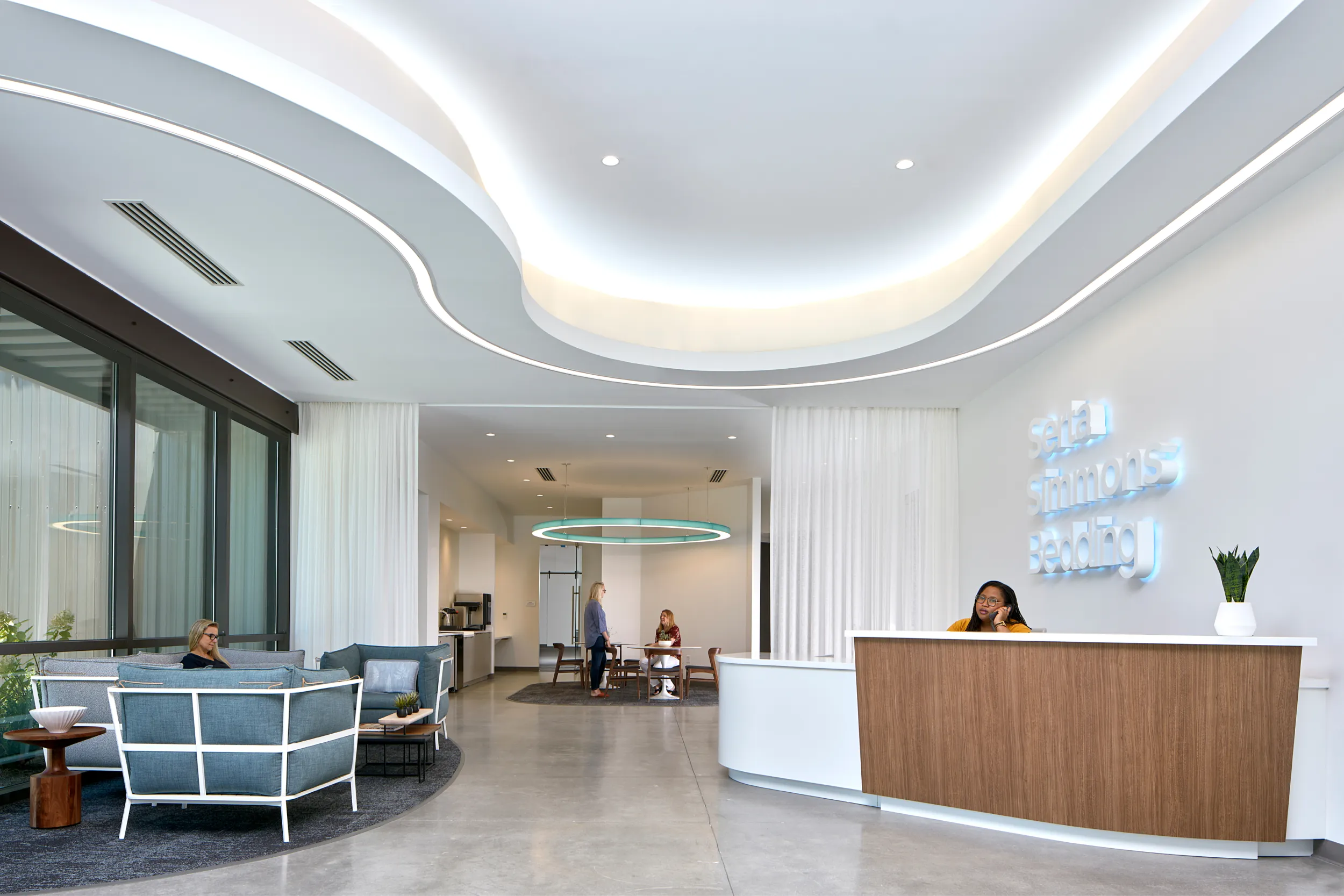 Hendrick partnered with SSB to create a headquarters that enhances brand, culture, and employee experience. The design emphasizes collaboration, innovation, and purposeful brand touches, showcasing SSB's legacy and commitment to quality sleep products. By focusing on "Thinking, Working, and Living Differently," the space supports continuous improvement and customer satisfaction through advanced sleep science.