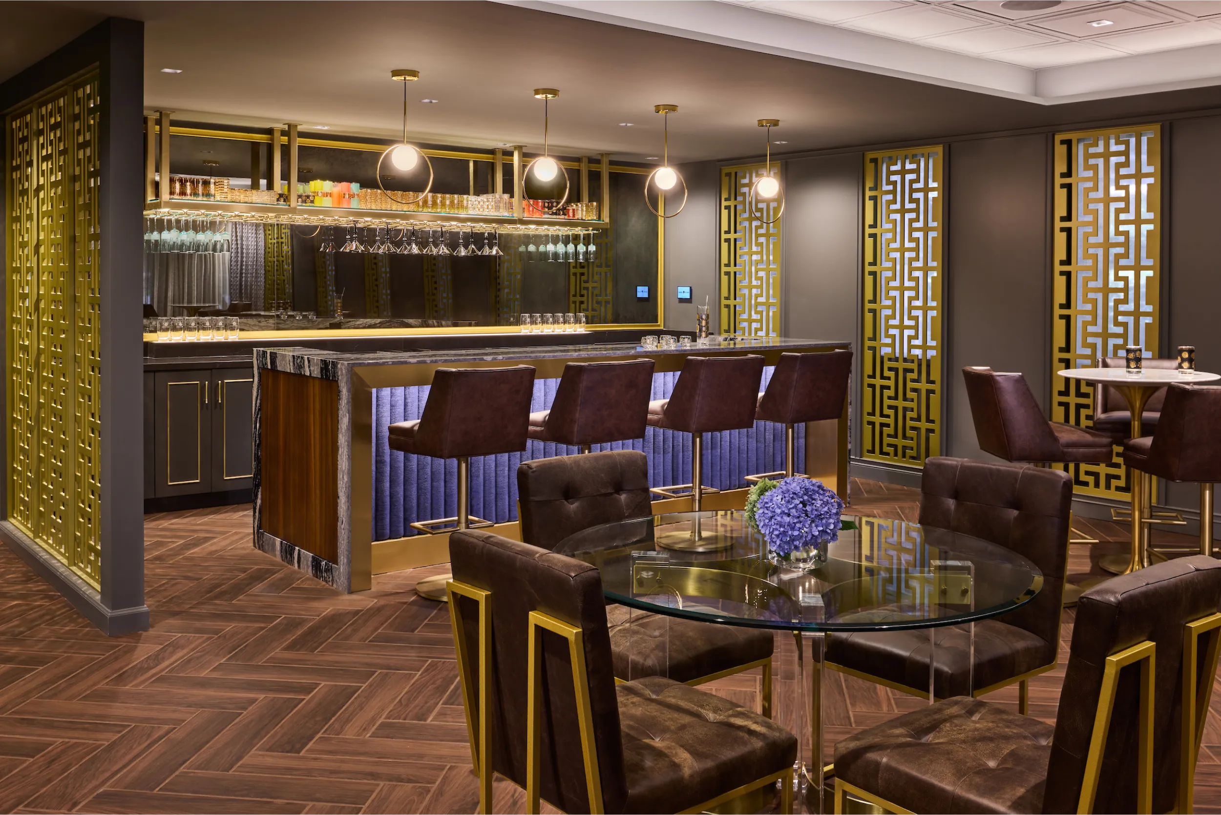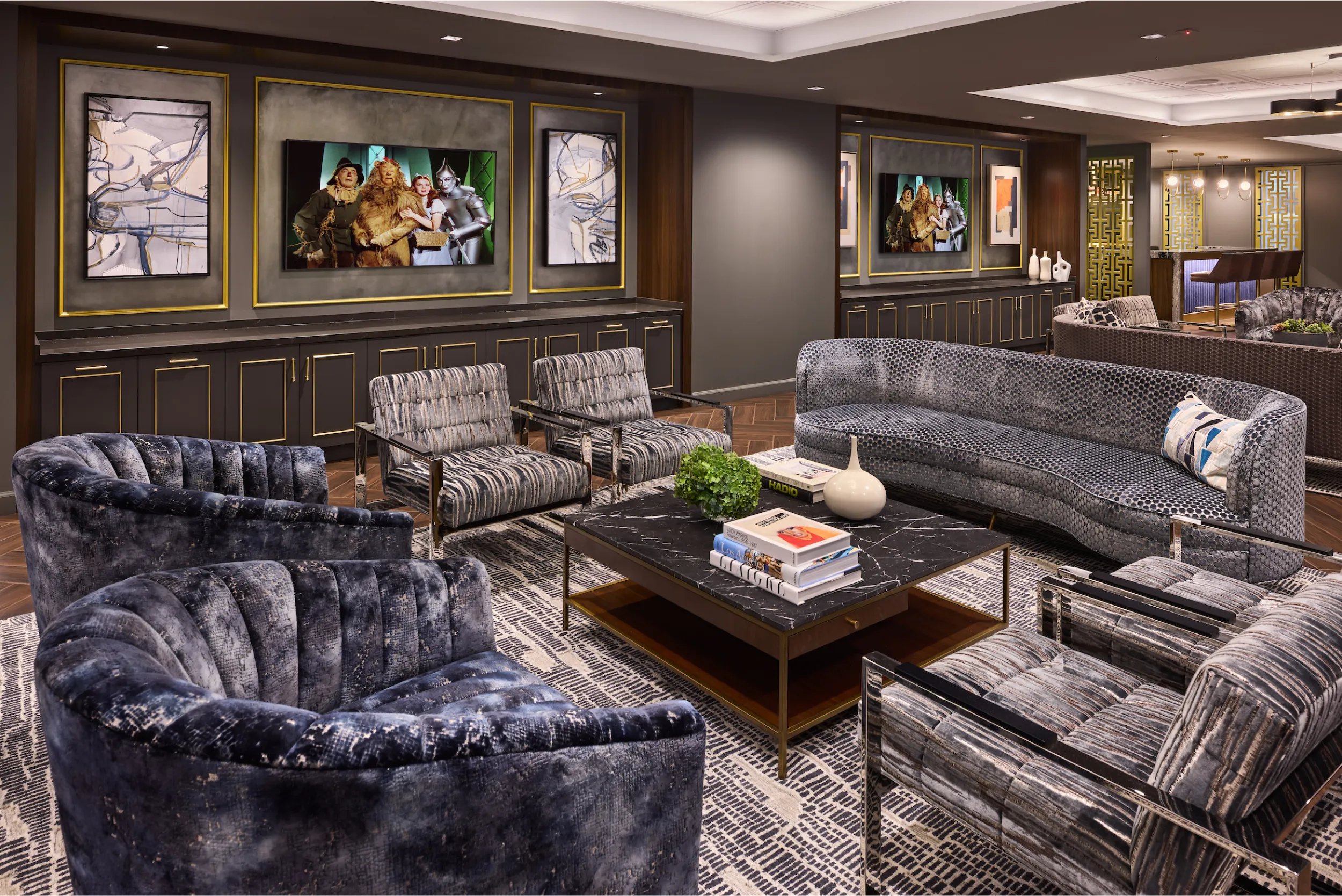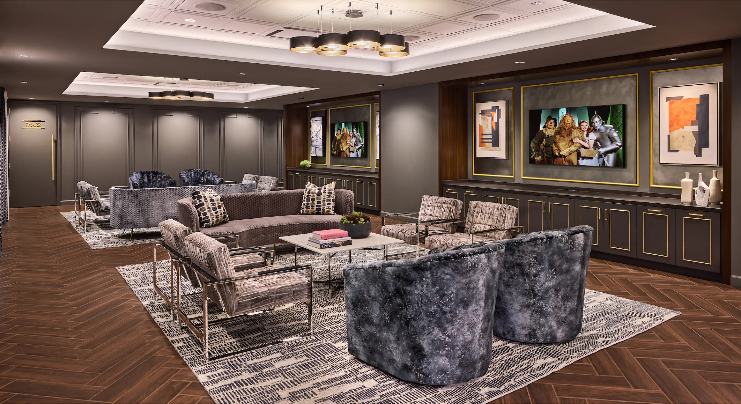 The design features a comfortable, residential-style reception area, an efficient breakroom, and specialized rooms for post-production and video creation. Unique elements like a screening room, lounge, bar, and pre-function spaces evoke Old Hollywood charm, with dark finishes and gold accents throughout. Additional amenities include a catering kitchen, a "Speakeasy" themed meeting room, and supplementary restrooms to support large hosted events, blending functionality with a glamorous, cinematic atmosphere.