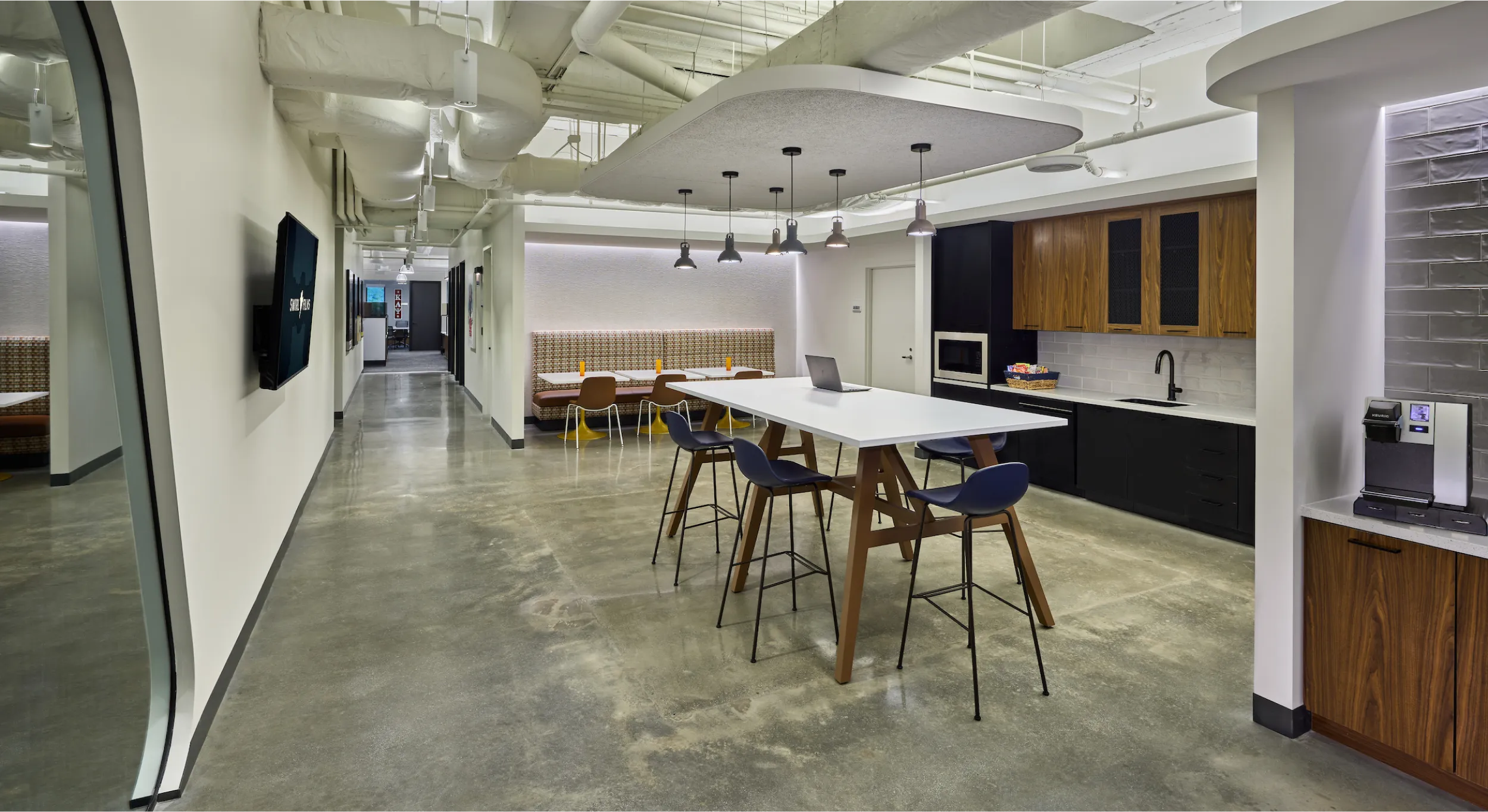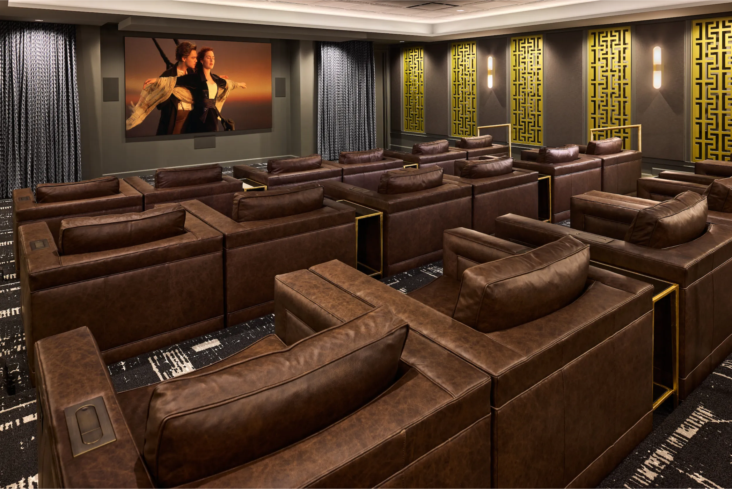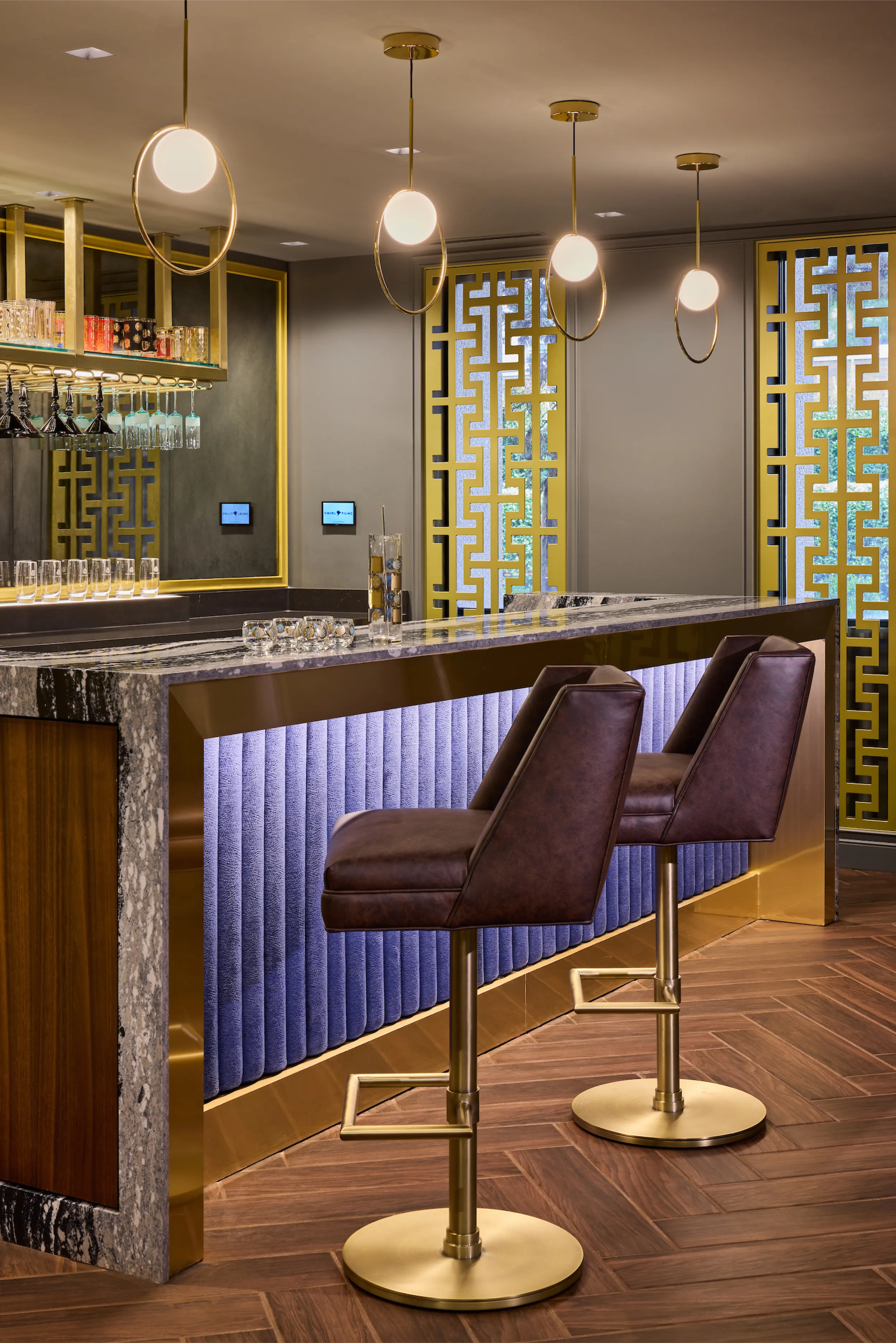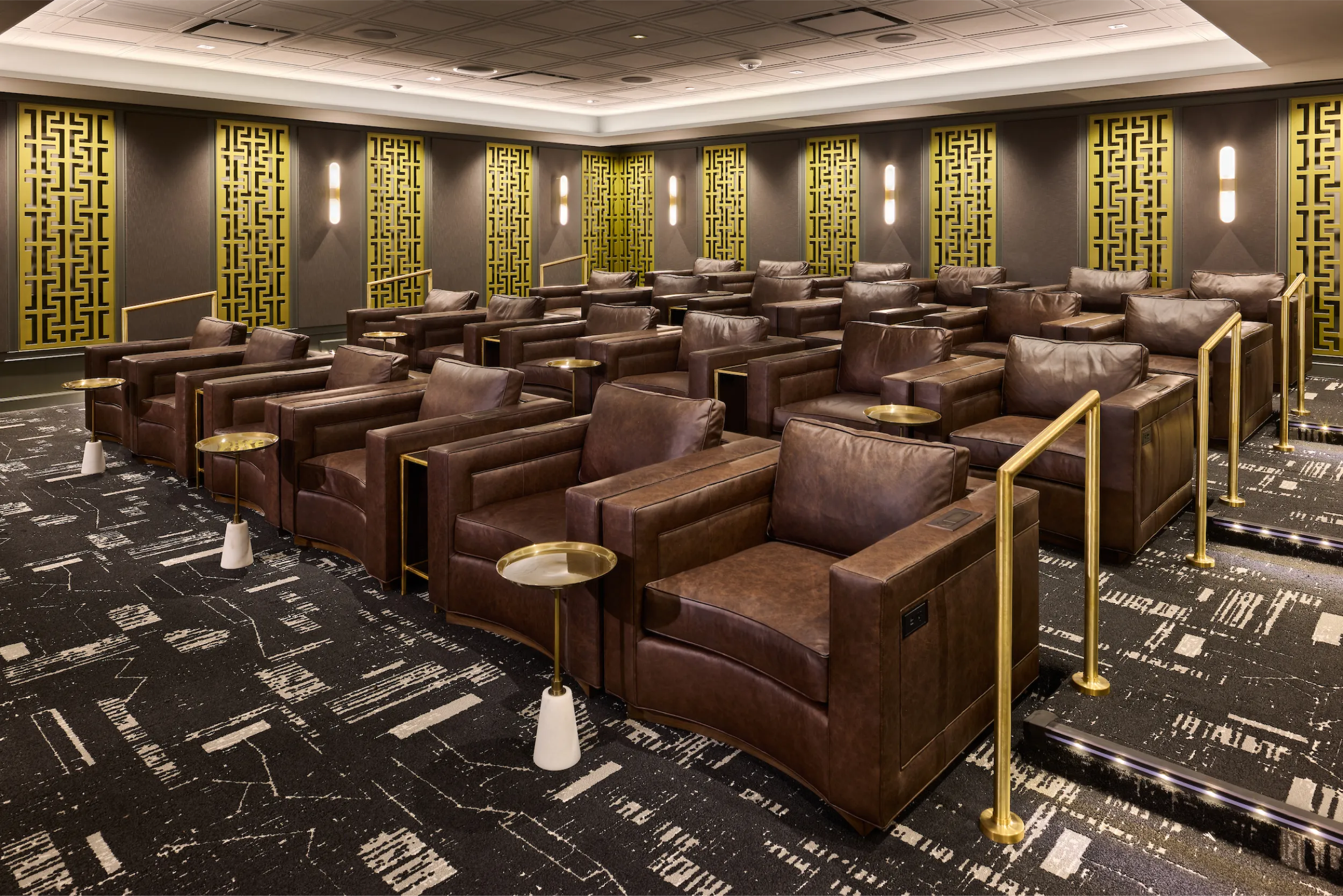 The design features a comfortable, residential-style reception area, an efficient breakroom, and specialized rooms for post-production and video creation. Unique elements like a screening room, lounge, bar, and pre-function spaces evoke Old Hollywood charm, with dark finishes and gold accents throughout. Additional amenities include a catering kitchen, a "Speakeasy" themed meeting room, and supplementary restrooms to support large hosted events, blending functionality with a glamorous, cinematic atmosphere.