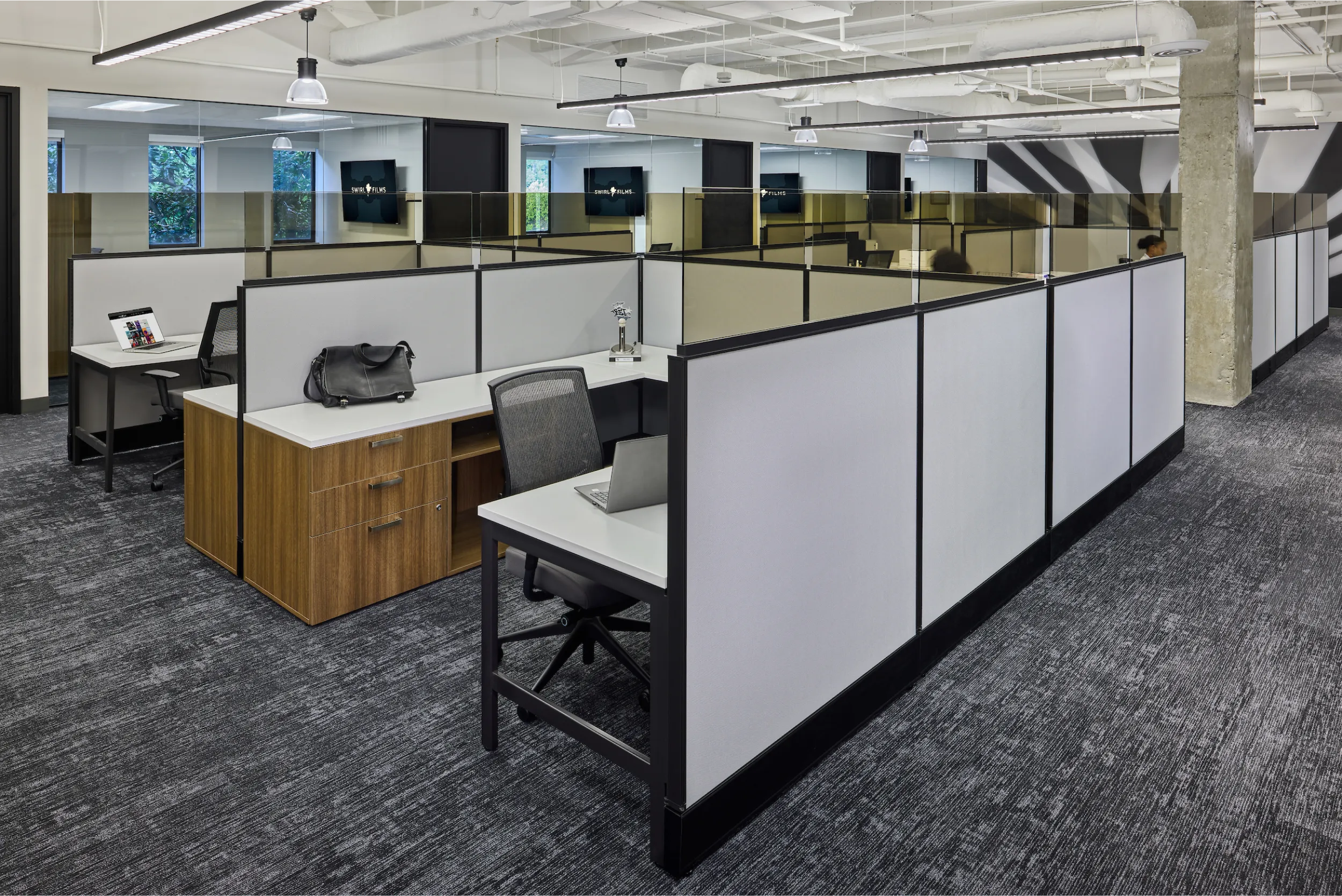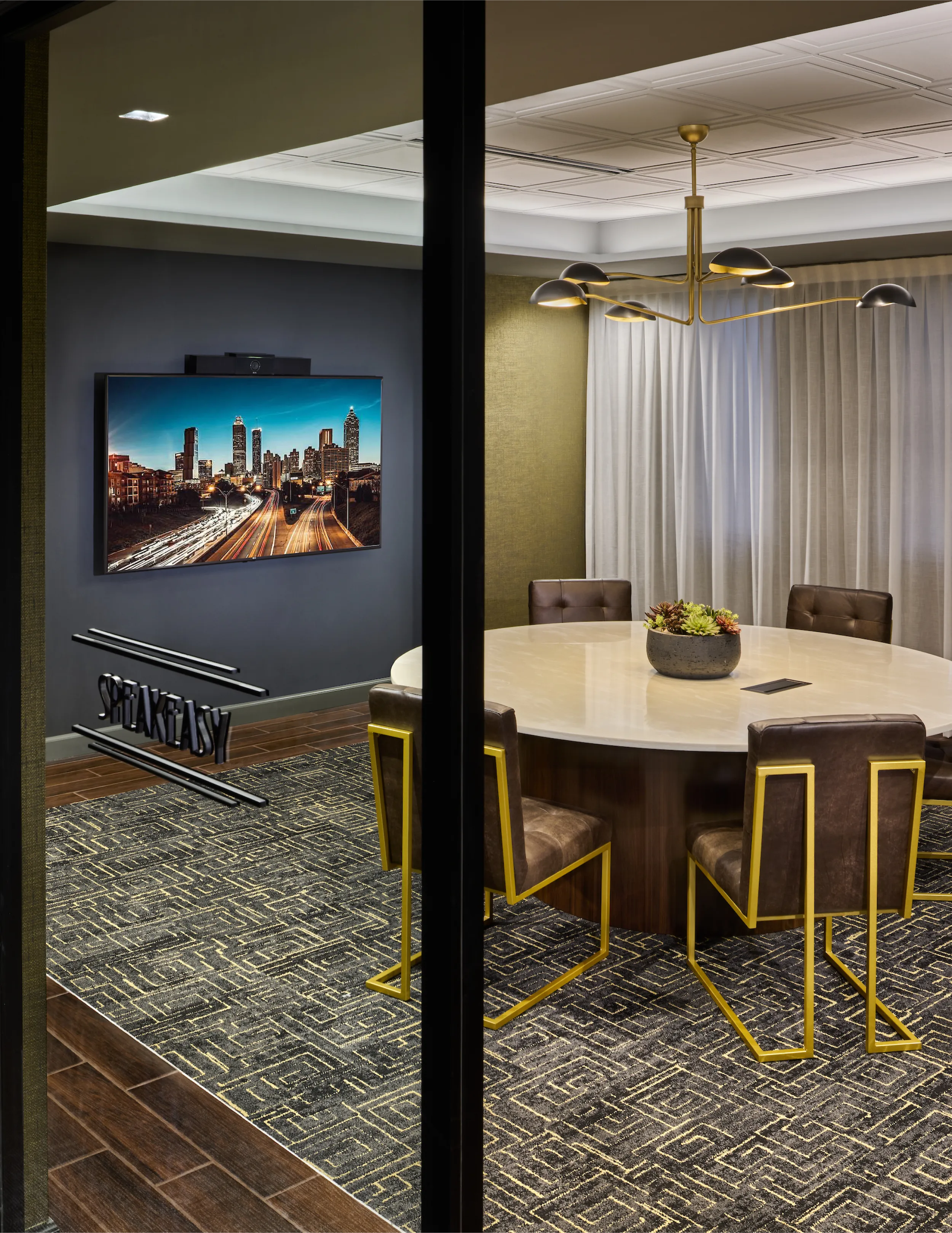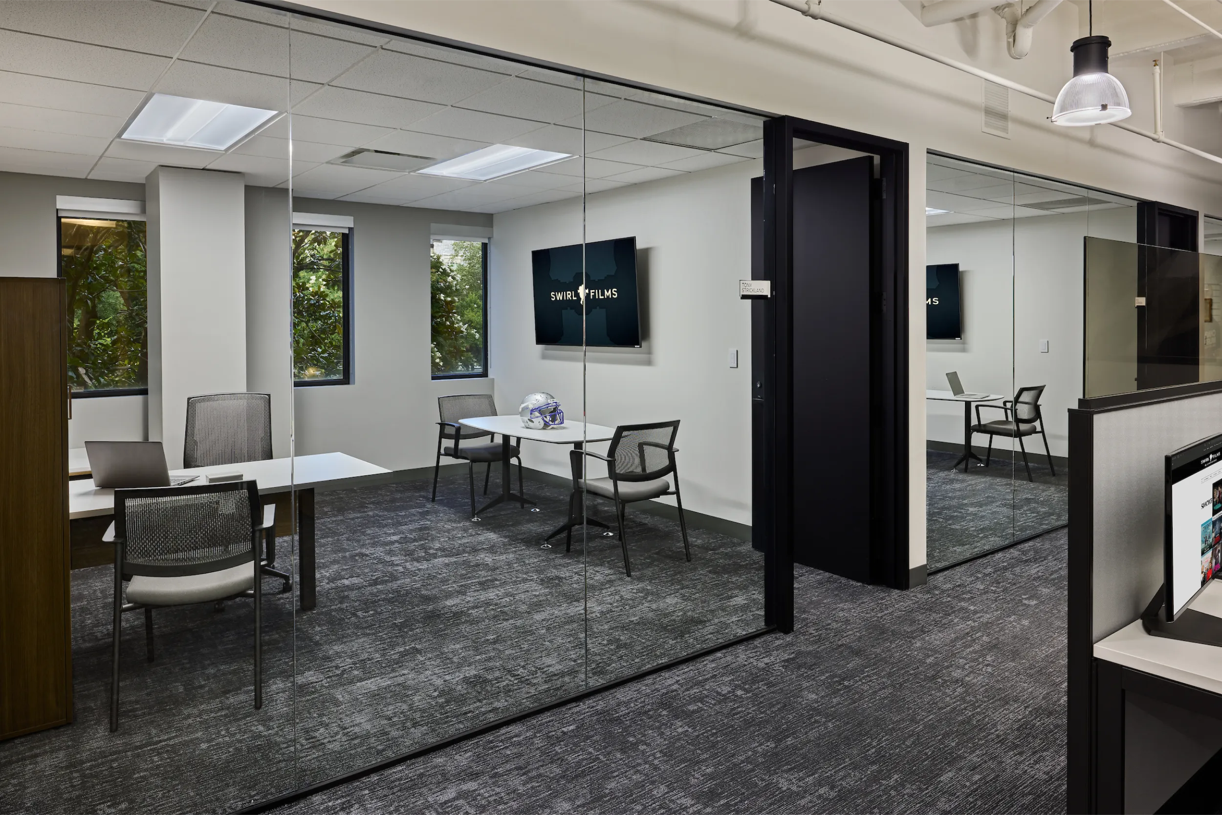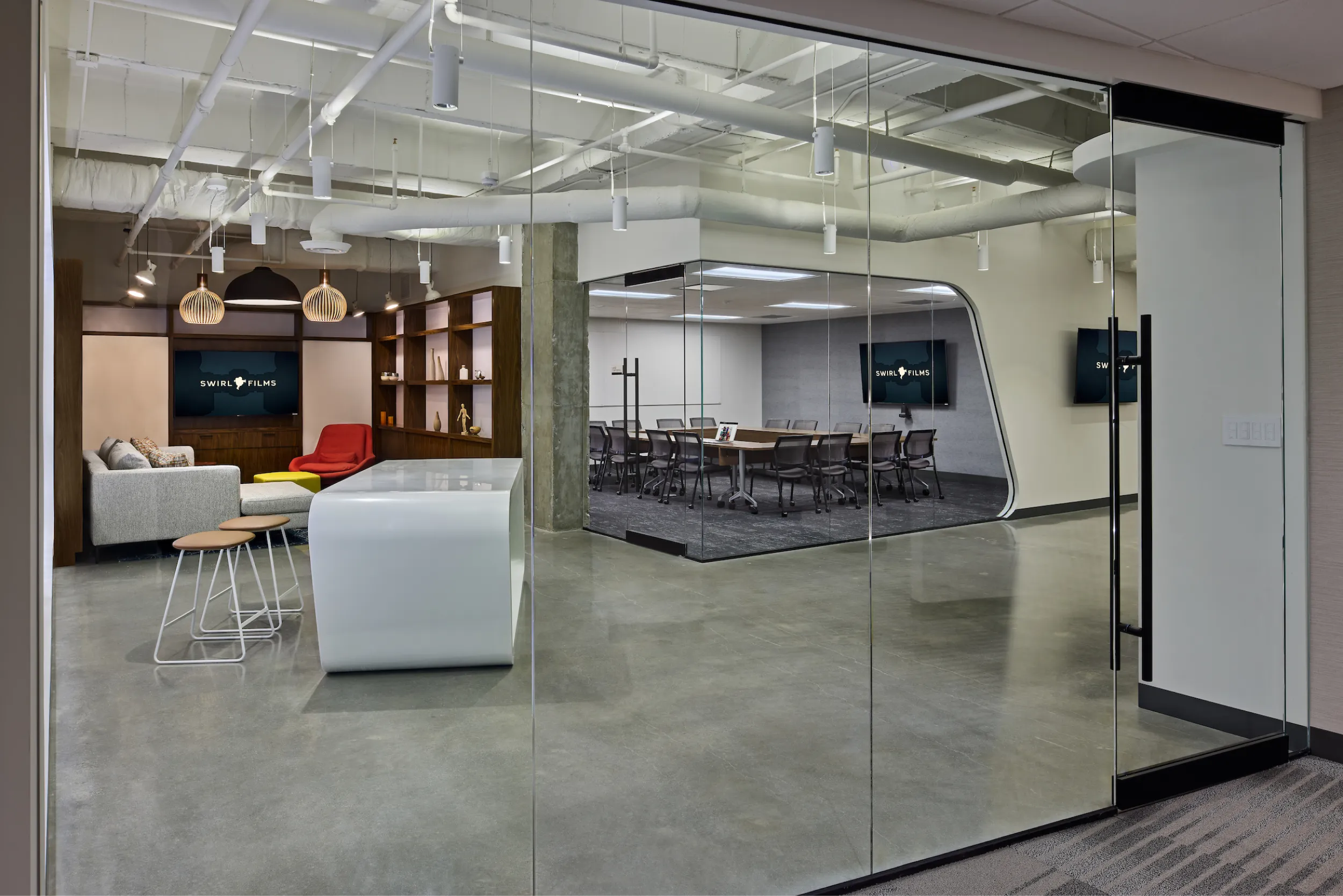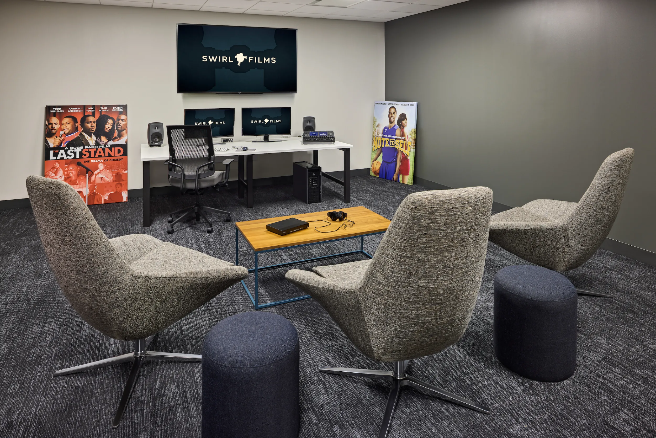 Swirl Films, Atlanta's leading independent film and TV production company with a focus on diversity and inclusion, sought to create an inviting office space within their 100,000-square-foot studio. Their production services span from script to screen, including movies, biopics, scripted series, and documentaries, and the new space needed to reflect the glamour of Hollywood while supporting a wide range of functions.